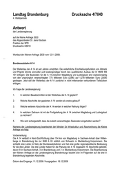 Landtag Brandenburg Drucksache 4/7040 4. Wahlperiode Antwort der Landesregierung auf die Kleine Anfrage 2630 des Abgeordneten Dr. Jens Klocksin Fraktion der SPD Drucksache 4/6910 Wortlaut der Kleinen Anfrage 2630 vom 12.11.2008: Bundesautobahn A 14 Der Weiterbau der A 14 ist seit Jahren umstritten. Die verkehrliche Erschließungsfunktion von Altmark und Prignitz könnte sinnvoller und kostengünstiger durch den qualifizierten Ausbau der B 189/B 5/B 191 erfolgen. Die Baukosten für die A 14 zwischen Magdeburg und Ludwigslust sind explosionsartig von den ursprünglich veranschlagten 775 Millionen Euro (2006) auf 1,278 Milliarden Euro (2008) gestiegen. Jetzt soll der Weiterbau der A 14 zunächst in nicht miteinander verbundenen Teilstücken erfolgen. Ich frage die Landesregierung: 1. In welchen Bauabschnitten ist der Weiterbau der A 14 geplant? 2. Welche Abschnitte der geplanten A 14 werden als erstes gebaut? 3. Welche weiteren Abschnitte der A 14 werden in welcher Reihung folgen? 4. In welchem Zeitraum ist mit der Fertigstellung der A 14 zwischen Magdeburg und Ludwigslust zu rechnen? 5. Wie wird sichergestellt, dass die zuletzt veranschlagten Baukosten eingehalten werden? Namens der Landesregierung beantwortet der Minister für Infrastruktur und Raumordnung die Kleine Anfrage wie folgt: Vorbemerkung: Die A 14 verläuft in Nord-Süd-Richtung über 154 km von Magdeburg in Sachsen-Anhalt über Witten- berge in Brandenburg bis zur BAB A 24 südlich von Schwerin in Mecklenburg-Vorpommern. Sie schließt eine Lücke im Netz der Bundesautobahnen und hat eine große regionalpolitische Bedeutung für die drei Länder. Die drei Länder haben für die Planung der A 14 insgesamt 14 Abschnitte gebildet, davon 9 in Sachsen-Anhalt, 3 in Brandenburg und 2 in Mecklenburg-Vorpommern. Die Beantwortung der Kleinen Anfrage an die Landesregierung Brandenburgs bezieht sich im Folgenden auf die drei in Brandenburg liegenden Abschnitte. Datum des Eingangs: 11.12.2008 / Ausgegeben: 16.12.2008