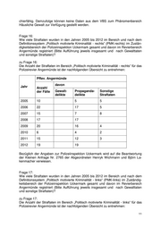 chierfähig. Demzufolge können keine Daten aus dem VBS zum Phänomenbereich Häusliche Gewalt zur Verfügung gestellt werden. Frage 16: Wie viele Straftaten wurden in den Jahren 2005 bis 2012 im Bereich und nach dem Definitionssystem „Politisch motivierte Kriminalität - rechts“ (PMK-rechts) im Zustän- digkeitsbereich der Polizeiinspektion Uckermark gesamt und davon im Revierbereich Angermünde registriert (Bitte Aufführung jeweils insgesamt und nach Gewalttaten und sonstige Straftaten)? zu Frage 16: Die Anzahl der Straftaten im Bereich „Politisch motivierte Kriminalität - rechts“ für das Polizeirevier Angermünde ist der nachfolgenden Übersicht zu entnehmen: PRev. Angermünde davon Jahr Anzahl der Fälle Gewalt- Propaganda- Sonstige delikte delikte Straftaten 2005 10 5 5 2006 22 17 5 2007 15 7 8 2008 17 17 2009 20 16 4 2010 6 4 2 2011 15 12 3 2012 19 19 Bezüglich der Angaben zur Polizeiinspektion Uckermark wird auf die Beantwortung der Kleinen Anfrage Nr. 2765 der Abgeordneten Henryk Wichmann und Björn La- kenmacher verwiesen. Frage 17: Wie viele Straftaten wurden in den Jahren 2005 bis 2012 im Bereich und nach dem Definitionssystem „Politisch motivierte Kriminalität - links“ (PMK-links) im Zuständig- keitsbereich der Polizeiinspektion Uckermark gesamt und davon im Revierbereich Angermünde registriert (Bitte Aufführung jeweils insgesamt und nach Gewalttaten und sonstige Straftaten)? zu Frage 17: Die Anzahl der Straftaten im Bereich „Politisch motivierte Kriminalität - links“ für das Polizeirevier Angermünde ist der nachfolgenden Übersicht zu entnehmen: