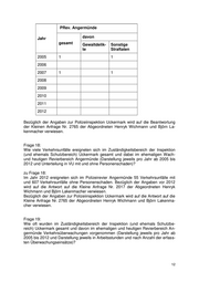 PRev. Angermünde Jahr davon gesamt Gewaltdelik- Sonstige te Straftaten 2005 1 1 2006 2007 1 1 2008 2009 2010 2011 2012 Bezüglich der Angaben zur Polizeiinspektion Uckermark wird auf die Beantwortung der Kleinen Anfrage Nr. 2765 der Abgeordneten Henryk Wichmann und Björn La- kenmacher verwiesen. Frage 18: Wie viele Verkehrsunfälle ereigneten sich im Zuständigkeitsbereich der Inspektion (und ehemals Schutzbereich) Uckermark gesamt und dabei im ehemaligen Wach- und heutigen Revierbereich Angermünde (Darstellung jeweils pro Jahr ab 2005 bis 2012 und Unterteilung in VU mit und ohne Personenschaden)? zu Frage 18: Im Jahr 2012 ereigneten sich im Polizeirevier Angermünde 55 Verkehrsunfälle mit und 607 Verkehrsunfälle ohne Personenschaden. Bezüglich der Angaben vor 2012 wird auf die Antwort auf die Kleine Anfrage Nr. 2017 der Abgeordneten Henryk Wichmann und Björn Lakenmacher verwiesen. Bezüglich der Angaben zur Polizeiinspektion Uckermark wird auf die Antwort auf die Kleine Anfrage Nr. 2765 der Abgeordneten Henryk Wichmann und Björn Lakenma- cher verwiesen. Frage 19: Wie oft wurden im Zuständigkeitsbereich der Inspektion (und ehemals Schutzbe- reich) Uckermark gesamt und davon im ehemaligen und heutigen Revierbereich An- germünde Verkehrsüberwachungen vorgenommen (Darstellung jeweils pro Jahr ab 2005 bis 2012 und Darstellung jeweils in Arbeitsstunden und nach Anzahl der erfass- ten Überwachungseinsätze)?