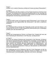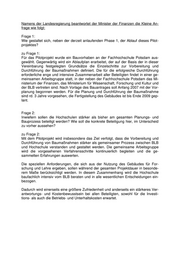 Frage 3: Inwiefern und in welcher Zeitschiene erfolgt eine Evaluierung dieses Pilotprojektes? zu Frage 3: Nach Fertigstellung des Bauvorhabens soll die Projekt-Auswertung Aufschluss darü- ber geben, ob die gewonnenen Erkenntnisse Modellcharakter für die zukünftige Ge- staltung des Hochschulbaus in Brandenburg haben können und ob die Hochschulen weitergehende Verantwortung übernehmen sollen. Frage 4: In welchem Maße werden die Ergebnisse dieses Pilotprojektes in das Vorhaben der Landesregierung, die Liegenschaften der Hochschulen in den BLB zu überführen, einfließen? zu Frage 4: Ein unmittelbarer Bezug zwischen dem Pilotprojekt und der nach dem Gesetz zur Er- richtung des BLB vom 22.12.2005 vorgesehenen Bewirtschaftung der Landesliegen- schaften durch den BLB besteht nicht. Frage 5: Wo sieht die Landesregierung Chancen und Risiken bzw. Probleme bei einer stär- keren Einbindung der Hochschulen in den Planungs- und Bauprozess? zu Frage 5: Durch die noch stärkere Einbindung der Hochschulen in den Planungs- und Baupro- zess können Nutzeranforderungen möglicherweise rechtzeitiger und eindeutiger defi- niert, Wirtschaftlichkeitsaspekte wie Betriebs- und Unterhaltungskosten stärker als bisher beachtet und frühzeitig alternative Möglichkeiten zur Bedarfdeckung – wie Miet-, Kauf- statt Eigenerstellung – abgewogen werden. Die Landesregierung sieht hierbei auch Optimierungspotenziale in Bezug auf Benutzbarkeit und Wirtschaftlich- keit des Gebäudebetriebs. Die Landesregierung ist der Auffassung, dass die in dem Pilotprojekt und den hie- raus abzuleitenden Verbesserungen liegenden Chancen die Risiken, die mit einer Verbreiterung der Entscheidungsbasis verbunden sein können, überwiegen.