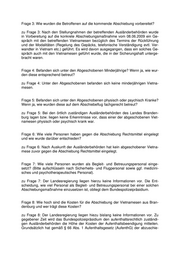 Frage 3: Wie wurden die Betroffenen auf die kommende Abschiebung vorbereitet? zu Frage 3: Nach den Stellungnahmen der betreffenden Ausländerbehörden wurde in Vorbereitung auf die konkrete Abschiebungsmaßnahme vom 08.06.2009 ein Ge- spräch mit den betreffenden Vietnamesen bezüglich des Termins der Rückführung und der Modalitäten (Regelung des Gepäcks, telefonische Verständigung evtl. Ver- wandter in Vietnam etc.) geführt. Es wird davon ausgegangen, dass ein solches Ge- spräch auch mit den Vietnamesen geführt wurde, die in der Sicherungshaft unterge- bracht waren. Frage 4: Befanden sich unter den Abgeschobenen Minderjährige? Wenn ja, wie wur- den diese entsprechend betreut? zu Frage 4: Unter den Abgeschobenen befanden sich keine minderjährigen Vietna- mesen. Frage 5: Befanden sich unter den Abgeschobenen physisch oder psychisch Kranke? Wenn ja, wie wurden diese auf dem Abschiebeflug fachgerecht betreut? zu Frage 5: Bei den örtlich zuständigen Ausländerbehörden des Landes Branden- burg lagen bzw. liegen keine Erkenntnisse vor, dass einer der abgeschobenen Viet- namesen physisch oder psychisch krank war. Frage 6: Wie viele Personen haben gegen die Abschiebung Rechtsmittel eingelegt und wie wurde darüber entschieden? zu Frage 6: Nach Auskunft der Ausländerbehörden hat kein abgeschobener Vietna- mese zuvor gegen die Abschiebung Rechtsmittel eingelegt. Frage 7: Wie viele Personen wurden als Begleit- und Betreuungspersonal einge- setzt? (Bitte aufschlüsseln nach Sicherheits- und Flugpersonal sowie ggf. medizini- sches und psychotherapeutisches Personal). zu Frage 7: Der Landesregierung liegen hierzu keine Informationen vor. Die Ent- scheidung, wie viel Personal als Begleit- und Betreuungspersonal bei einer solchen Abschiebungsmaßnahme einzusetzen ist, obliegt dem Bundespolizeipräsidium. Frage 8: Wie hoch sind die Kosten für die Abschiebung der Vietnamesen aus Bran- denburg und wer trägt diese Kosten? zu Frage 8: Der Landesregierung liegen hiezu bislang keine Informationen vor. Zu gegebener Zeit wird das Bundespolizeipräsidium den aufenthaltsrechtlich zuständi- gen Ausländerbehörden die Höhe der Kosten der Aufenthaltsbeendigung mitteilen. Grundsätzlich hat gemäß § 66 Abs. 1 Aufenthaltsgesetz (AufenthG) der abzuschie-