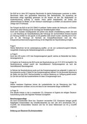 Der BLB hat im Jahre 2012 begonnen Benchmarks für gleiche Nutzergruppen zusammen zu stellen. Benchmarks bieten eine ganzheitliche Betrachtung aller Betriebskosten. Die Auswertung der Benchmarks erfolgt regelmäßig gemeinsam mit den Nutzern mit dem Ziel, Möglichkeiten zur Kostenreduzierung ausfindig zu machen. Hierzu gehört beispielsweise, der Einbau von Zähleinrichtungen für Medien, um den Verbrauch nutzerbezogen zu ermitteln und abzurechnen (bisher Umlage nach m²-Schlüssel). Der Fuhrpark des BLB ist seit 2012 EMAS III zertifiziert. Seither werden die Verbrauchs- und Emissio- nenwerte für jedes Fahrzeug auf der Grundlage der Herstellerangaben erfasst. Durch einen neutralen Umweltgutachter wird jährlich eine aktuelle Umwelterklärung erstellt. Dort wird u.a. unter Beachtung der Gesamtlaufleistung aller Fahrzeuge der durchschnittliche Emission-Ausstoß pro Fahrzeug ermittelt. Es wird geprüft, ob die gestellten Ziele erreicht wurden. Zukünftig wird im Fuhr- park für alle Fahrzeuge ein Nachweis der Energieeffizienzklassen nach der Pkw- Energieverbrauchskennzeichnungsverordnung mit der Möglichkeit der Reporterstellung ermöglicht. Frage 9: Welche Maßnahmen hat die Landesregierung ergriffen, um die vom Landesrechnungshof kritisierte, mangelhafte Umsetzung des Gebäudemanagements zu verbessern? zu Frage 9: Durch den LRH wurde in 2013 das Energiemanagement geprüft, welches ein Bestandteil des Gebäu- demanagements ist. Im Ergebnis der Evaluierung des BLB wurde eine Neustrukturierung zum 01.01.2014 durchgeführt. Die Neustrukturierung umfasst sowohl den Geschäftsbereich Facilitymanagement als auch den Geschäftsbereich Baumanagement. Im Rahmen der Neustrukturierung wurde auch das Energiemanagement neu aufgestellt. In jedem der 4 Servicebereiche wurden 2 Stellen für das Energiemanagement definiert. Für die personelle Absicherung der Stellen sind dem BLB 3 Nachwuchsstellen zur externen Besetzung zur Verfügung gestellt worden. Zur Zeit führt der BLB das Auswahlverfahren für diese 3 Energiemanager durch. Frage 10: Welche messbaren Ergebnisse können die Landesbehörden bei der Reduzierung ihrer Treib- hausgasemissionen vorweisen und wo sind diese für den interessierten Bürger veröffentlicht? zu Frage 10: Eine aktuelle Analyse zu den zu erwartenden CO2 -Emissionen im Ergebnis der erfolgten Ökostrom- Ausschreibung wurde unter folgenden Prämissen durchgeführt: Berechnungsgrundlage: Die durch konventionellen Strom bzw. Graustrom verursachten CO2 -Emissionen betragen gemäß festgelegtem Emissionsfaktor des Umweltbundesamtes aus dem Jahr 2012 anrechenbare 576 g CO2/kWh. Der Emissionsfaktor Ökostrom wird hier mit einem Referenzwert von 50 g CO 2/kWh angesetzt. Erklärung zum Ökostrom-CO2-Emissionsfaktor: