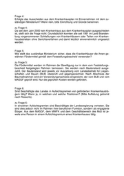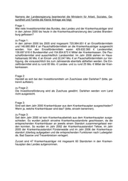 Namens der Landesregierung beantwortet die Ministerin für Arbeit, Soziales, Ge- sundheit und Familie die Kleine Anfrage wie folgt: Frage 1: Wie viele Investitionsmittel des Bundes, des Landes und der Krankenhausträger sind in den Jahren 2000 bis heute in die Krankenhausfinanzierung des Landes Branden- burg geflossen? zu Frage 1: In den Jahren 2000 bis 2005 sind insgesamt 720.984.651 € an Einzelfördermitteln und 146.680.869 € an Pauschalfördermitteln an die Krankenhausträger ausgereicht worden. Von den Einzelfördermitteln waren 429.632.360 € Landesmittel, 136.697.618 € Bundesmittel und 154.654.673 € Mittel der Krankenkassen. Die Pau- schalfördermittel sind ausschließlich Landesmittel. Im Jahr 2006 stehen im Haus- haltsansatz 90 Mio. € an Einzel- und 22,047 Mio. € an Pauschalfördermitteln zur Ver- fügung, die voraussichtlich bis zum Jahresende ebenfalls abfließen werden. Die Ein- zelfördermittel sind zu rund 65 Mio. € Landes- und zu rund 25 Mio. € Mittel der Kran- kenkassen. Frage 2: Handelt es sich bei den Investitionsmitteln um Zuschüsse oder Darlehen? (bitte, ge- trennt auflisten). zu Frage 2: Die Investitionsförderung wird als Zuschuss gewährt. Darlehen werden vom Land nicht ausgereicht. Frage 3: Sind seit dem Jahr 2000 Krankenhäuser aus dem Krankenhausplan ausgeschieden? Wenn ja, welche Krankenhäuser sind das? (bitte, einzeln benennen). zu Frage 3: Seit dem Jahr 2000 ist kein Krankenhausbetrieb aus dem Krankenhausplan ausge- schieden. Es wurden jedoch einzelne Krankenhausstandorte geschlossen, da die entsprechenden Krankenhäuser an jeweils einem Standort zusammengefasst wer- den konnten. So wurden im Jahr 2002 der Krankenhausstandort Teltow, im Jahr 2005 der Krankenhausstandort Fürstenwalde und im Jahr 2006 der Krankenhaus- standort Jüterbog aufgegeben und die entsprechenden Funktionen nach Ludwigsfel- de, Bad Saarow und Treuenbrietzen verlagert. Zurzeit sind 47 Krankenhausträger mit insgesamt 60 Standorten in den Kranken- hausplan des Landes aufgenommen.