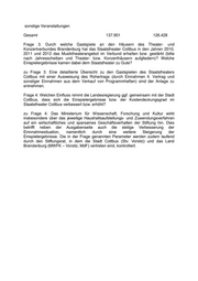 sonstige Veranstaltungen Gesamt 137.901 126.428 Frage 3: Durch welche Gastspiele an den Häusern des Theater- und Konzertverbundes Brandenburg hat das Staatstheater Cottbus in den Jahren 2010, 2011 und 2012 das Musiktheaterangebot im Verbund erhalten bzw. gestärkt (bitte nach Jahresscheiben und Theater- bzw. Konzerthäusern aufgliedern)? Welche Einspielergebnisse kamen dabei dem Staatstheater zu Gute? zu Frage 3: Eine detaillierte Übersicht zu den Gastspielen des Staatstheaters Cottbus mit einer Ausweisung des Rohertrags (durch Einnahmen lt. Vertrag und sonstiger Einnahmen aus dem Verkauf von Programmheften) sind der Anlage zu entnehmen. Frage 4: Welchen Einfluss nimmt die Landesregierung ggf. gemeinsam mit der Stadt Cottbus, dass sich die Einspielergebnisse bzw. der Kostendeckungsgrad im Staatstheater Cottbus verbessert bzw. erhöht? zu Frage 4: Das Ministerium für Wissenschaft, Forschung und Kultur wirkt insbesondere über das jeweilige Haushaltsaufstellungs- und Zuwendungsverfahren auf ein wirtschaftliches und sparsames Geschäftsverhalten der Stiftung hin. Dies betrifft neben der Ausgabenseite auch die stetige Verbesserung der Einnnahmesituation, namentlich durch eine weitere Steigerung der Einspielergebnisse. Die in der Frage genannten Parameter werden zudem laufend durch den Stiftungsrat, in dem die Stadt Cottbus (Stv. Vorsitz) und das Land Brandenburg (MWFK – Vorsitz, MdF) vertreten sind, kontrolliert.