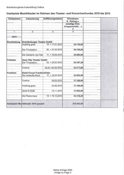 Brandenburgische Kulturstiftung Cottbus Gastspiele Musiktheater im Rahmen des Theater- und Konzertverbundes 2010 bis 2012 Gastspielort Inszenierung Aufführungsdatum Einnahmen lt. Vertrag u. sonstige Einn. (Programmhefte ... € 1 2 3 4 2012 Brandenburg Brandenburger Theater GmbH Aida 20. + 22.01.2012 22.278,00 Potsdam Hans Otto Theater GmbH Eugen Onegin 04. + 06.05.2012 51.201,60 Rusalka 02. + 03.11.2012 34.324,00 Frankfurt Kleist Forum Frankfurt/Oder Hänsel und Gretel 10. + 12.02.2012 34.154,80 Orpheus 23.03.2012 17.102,60 Eugen Onegin 27.04.2012 17.050,40 Rusalka 09. + 11.11.2012 34.232,20 Gastspiele Musiktheater 2012 gesamt 210.343,60 2011 Brandenburg Brandenburger Theater GmbH Romeo et Juliette 8. + 10.04.2011 22.160,00 Potsdam Hans Otto Theater GmbH Candide 30.04. + 01.05.2011 34.189,00 Romeo et Juliette 27. + 29.05.2011 34.124,20 Jekyll & Hyde 01. + 02.10.2011 17.106,20 Frankfurt Kleist Forum Frankfurt/Oder Zauberer von Oss 9. + 10.01.2011 34.000,00 Romeo et Juliette 18. 20.02.2011 34.099,00 Genoveva 12.03.2011 17.091,80 Eugen Onegin 30.03.2011 17.073,80 Aida 07. + 09.10.2011 34.299,00 Gastspiele Musiktheater 2011 gesamt 244.143,00 Kleine Anfrage 2095 Anlage zu Frage 3