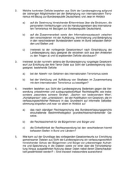 2. Welche konkreten Defizite bestehen aus Sicht der Landesregierung aufgrund der bisherigen Möglichkeiten bei der Bekämpfung von internationalem Terro- rismus mit Bezug zur Bundesrepublik Deutschland; und zwar im Hinblick a) auf die Gewinnung hinreichender Erkenntnisse über die Strukturen, die personellen Verflechtungen und die Handlungsweisen des internationa- len Terrorismus mit Bezügen zur Bundesrepublik Deutschland, b) auf die Zusammenarbeit sowie den Informationsaustausch zwischen den verschiedenen mit der Aufklärung, Verhinderung und Bekämpfung in den verschiedenen Bundesländern sowie im Bund befassten Behör- den und Stellen und c) inwieweit ist der vorliegende Gesetzentwurf nach Einschätzung der Landesregierung dazu geeignet die einzelnen sich aus den Antworten zu den Fragen a) und b) ergebenden Defizite abzubauen? 3. Inwieweit ist der nunmehr seitens der Bundesregierung vorgelegte Gesetzent- wurf zur Errichtung der Anti-Terror-Datei aus Sicht der Landesregierung dazu geeignet, bestehende Defizite a) bei der Abwehr von Gefahren des internationalen Terrorismus sowie b) bei der Verhütung und Aufklärung von Straftaten im Zusammenhang mit dem internationalen Terrorismus zu beseitigen? 4. Inwiefern bestehen aus Sicht der Landesregierung Bedenken gegen die Ver- wendung unbestimmter und auslegungsbedürftiger Rechtsbegriffe, wie insbe- sondere „besonders schwere Straftat“, „Sachen von bedeutendem Wert“, „Kontaktperson“ oder „unterstützen“, bei der Kodifikation von Gesetzen, die im verfassungsrechtlicher Relevanz in das Grundrecht auf informelle Selbstbe- stimmung eingreifen und zwar vor allem im Hinblick auf a) das nach ständiger Rechtssprechung des Bundesverfassungsgerichts einzuhaltende Bestimmtheitsgebot grundrechtseinschränkender Ge- setze, b) die Rechtssicherheit für die Bürgerinnen und Bürger und c) die Einheitlichkeit der Rechtsanwendung bei den verschiedenen hiermit befassten Stellen in Bund und Ländern? 5. Wie kann auf der Grundlage des vorliegenden Gesetzentwurfs zur Einrichtung gemeinsamer Dateien aus Sicht der Landesregierung ein verfassungsrechtlich hinreichender Schutz der Bürgerinnen und Bürger vor unberechtigter Aufnah- me und Speicherung in die Dateien sowie vor einer über die Terrorbekämp- fung hinaus ausgedehnten Nutzung dieser Daten nebst deren Überschaubar- keit gewährleistet werden? – Sind insoweit insbesondere ausreichend