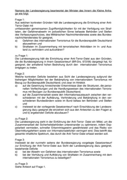 Namens der Landesregierung beantwortet der Minister des Innern die Kleine Anfra- ge wie folgt: Frage 1: Aus welchen konkreten Gründen hält die Landesregierung die Errichtung einer Anti- Terror-Datei mit umfassenden gemeinsamen Zugriffsmöglichkeiten für mit der Verfolgung von Straf- taten, der Gefahrenabwehr im polizeilichen Sinne befasste Behörden und Stellen des Verfassungsschutzes, des Militärischen Nachrichtendienstes sowie des Bundes- nachrichtendienstes für geeignet, a) Gefahren des internationalen Terrorismus für die Bundesrepublik Deutschland abzuwehren und b) Straftaten im Zusammenhang mit terroristischen Aktivitäten im In- und Aus- land zu verhindern und aufzuklären? zu Frage 1: Die Landesregierung hält die Einrichtung einer Anti-Terror-Datei aus den Gründen, die die Bundesregierung in ihrem Gesetzentwurf (BR-Drs. 672/06) dargelegt hat, für geeignet, der anhaltend hohen Bedrohung durch den internationalen Terrorismus entgegen zu treten. Frage 2: Welche konkreten Defizite bestehen aus Sicht der Landesregierung aufgrund der bisherigen Möglichkeiten bei der Bekämpfung von internationalem Terrorismus mit Bezug zur Bundesrepublik Deutschland; und zwar im Hinblick a) auf die Gewinnung hinreichender Erkenntnisse über die Strukturen, die perso- nellen Verflechtungen und die Handlungsweisen des internationalen Terroris- mus mit Bezügen zur Bundesrepublik Deutschland, b) auf die Zusammenarbeit sowie den Informationsaustausch zwischen den ver- schiedenen mit der Aufklärung, Verhinderung und Bekämpfung in den ver- schiedenen Bundesländern sowie im Bund befass ten Behörden und Stellen und c) inwieweit ist der vorliegende Gesetzentwurf nach Einschätzung der Landesre- gierung dazu geeignet die einzelnen sich aus den Antworten zu den Fragen a) und b) ergebenden Defizite abzubauen? zu Frage 2: Die Landesregierung sieht in der Einführung der Anti-Terror- Datei ein Mittel, um die Zusammenarbeit der Sicherheitsbehörden untereinander zu optimieren, indem Dop- pelarbeit vermieden, schneller Erkenntnisgewinn gewährleistet und das Risiko von Übermittlungsfehlern sowie von Informationsdefiziten verringert wird. Dies betrifft das gesamte inhaltliche Spektrum, das durch die Anti-Terror-Datei erfasst werden soll. Frage 3: Inwieweit ist der nunmehr seitens der Bundesregierung vorgelegte Gesetzentwurf zur Errichtung der Anti-Terror-Datei aus Sicht der Landesregierung dazu geeignet, bestehende Defizite a) bei der Abwehr von Gefahren des internationalen Terrorismus sowie b) bei der Verhütung und Aufklärung von Straftaten im Zusammenhang mit dem internationalen Terrorismus zu beseitigen? zu Frage 3: Siehe Antwort auf Frage 1.