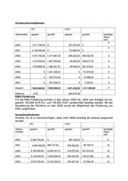 Infrastrukturmaßahmen EU Land Jahrscheibe geplant gezahlt geplant gezahlt bewilligte Stück- zahl 0 2000 1.311.700,00 0 437.233,00 0 4 2001 2.138.400,00 0 712.800,00 0 2002 1.815.700,00 1.477.697,00 605.233,00 492.532,00 3 2003 1.275.000,00 1.827.639,93 85.000,00 448.674,78 5 2004 1.079.869,00 1.566.301,91 80.939,00 261.319,91 3 2005 0 1.431.428,31 0 91.974,02 0 2006 0 810.372,00 0 13.086,00 2 2007 0 507.229,07 0 4.342,91 0 Gesamt 7.620.669,00 7.620.668,22 1.921.205,00 1.311.929,62 17 Differenz 0,78 609.275,38 KMU-Förderung Für die KMU-Förderung konnten in den Jahren 2002 bis 2004 vier Anträge mit ins- gesamt 150.800 EUR EU- und 150.800 EUR Landesmittel bewilligt werden. Mit der Novellierung der Richtlinie im Jahr 2005 wurde die Möglichkeit der Förderung von KMU aufgehoben. Umweltmaßnahmen Hinweis: Es ist zu berücksichtigen, dass mehr Mittel bewilligt als bislang ausgezahlt wurden. EU Land Jahres- geplant gezahlt geplant gezahlt bewilligte scheibe Stück- zahl 2000 5.462.700,00 0 364.180,00 0 0 2001 4.845.000,00 985.737,64 323.000,00 65.720,47 16 2002 4.784.600,00 3.048.337,31 318.973,00 201.616,23 15 2003 3.140.000,00 5.435.248,42 209.334,00 145.915,68 20 2004 3.519.700,00 9.125.249,67 234.647,00 97.346,39 16