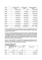 Jahr Ansatz lt. HHPl Ist-Ausgaben Minderausgaben EUR EUR EUR 2000 1.175.971,33 0,00 1.175.971,33 2001 1.278.229,70 73.388,57 1.204.841,13 2002 1.050.000,00 701.962,44 348.037,56 2003 700.000,00 680.000,00 20.000,00 2004 500.000,00 409.614,30 90.385,70 2005 400.000,00 127.797,44 272.202,56 2006 200.000,00 52.429,25 147.570,75 2007 311.600,00 199.497,18 112.102,82 Gesamt: 5.615.801,03 2.244.689,18 3.371.111,85 Frage 5: Wie bewertet es die Landesregierung, dass die Ist-Ausgaben des Landes zu den geplanten Soll-Ausgaben sehr stark vermindert ausfallen? Welche Rück- schlüsse zieht sie daraus? Zu Frage 5: Die Soll-Ist-Abweichungen erklären sich dadurch, dass Kofinanzierungs- mittel aus dem ehemaligen Sondervermögen des Landes – vertreten durch die BBG – bereitgestellt wurden und somit nicht bei der TG 87 abgeflossen sind. Das Son- dervermögen übernahm damit die vollständige Kofinanzierung bis zu 25 Prozent der Gesamtkosten. Darüber hinaus wurden in erheblichem Maße auch Mittel der Arbeits- förderung zur Kofinanzierung herangezogen. Frage 6: In wie vielen Fällen und in welcher Höhe erfolgte die Kofinanzierung der Zu- schüsse und Zuweisungen zur Förderung von KONVER-Folgemaßnahmen durch Dritte, z.B. durch Kommunen? (Bitte pro Jahr auflisten.) Zu Frage 6: Tabellen in EUR Infrastrukturmaßnahmen andere Drittmit- Stück- Stück- JS tel (AMB, SAM, zahl Kommunen zahl gesamt pro JS BSI u.a.)* 2000 0,00 0 0,00 0 0,00 2001 143.035,61 2 258.173,45 2 401.209,06 2002 0,00 0 470.500,92 3 470.500,92
