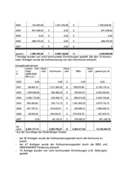 2003 134.203,69 1.321.445,89 5 1.455.649,58 2004 841.048,52 3 0,00 0 841.048,52 2005 0,00 0 0,00 0 0,00 2006 288.475,00 2 0,00 0 288.475,00 2007 0 0 0,00 0 0 gesamt: 1.406.762,40 7 2.050.120,68 10 3.456.883,08 7 Anträge wurden von nicht kommunalen Einrichtungen gestellt. Bei den 10 kommu- nalen Anträgen wurde die Kofinanzierung von den Kommunen erbracht. Umweltmaßnahmen andere Dritt- Stück Stück Stück J mittel -zahl Kommunen -zahl BBG -zahl gesamt pro JS S (AMB,SAM, BSI u.a.)* 2000 0,00 0,00 0 0,00 0,00 2001 89.064,10 1.311.084,35 6 738.970,69 2.139.119,14 2002 1.383.826,66 360.580,23 6 780.624,01 2.525.030,90 2003 2.282.172,89 343.956,74 8 806.613,63 3.432.743,26 2004 950.260,80 243.712,12 5 1.481.803,23 2.675.776,15 2005 507.797,61 154.040,81 4 426.690,31 1.088.528,73 2006 39.055,09 128.242,91 3 270.678,79 437.976,79 2007 0,00 62.133,41 3 759.036,37 821.169,78 ge- samt: 5.252.177,15 2.603.750,57 35 5.264.417,03 13.120.344,75 * Auf der Grundlage der förderfähigen Kosten - bei 35 Anträgen wurde der Kofinanzierungsanteil durch die Kommune er- bracht - bei 47 Anträgen wurde der Kofinanzierungsanteil durch die BBG und ABM/SAM/BSI Förderung erbracht - 10 Anträge wurden von nicht kommunalen Einrichtungen (z.B. Stiftungen) gestellt