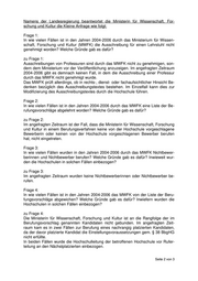 Namens der Landesregierung beantwortet die Ministerin für Wissenschaft, For- schung und Kultur die Kleine Anfrage wie folgt: Frage 1: In wie vielen Fällen ist in den Jahren 2004-2006 durch das Ministerium für Wissen- schaft, Forschung und Kultur (MWFK) die Ausschreibung für einen Lehrstuhl nicht genehmigt worden? Welche Gründe gab es dafür? zu Frage 1: Ausschreibungen von Professuren sind durch das MWFK nicht zu genehmigen, son- dern dem Ministerium vor der Veröffentlichung anzuzeigen. Im angefragten Zeitraum 2004-2006 gibt es demnach keinen Fall, in dem die Ausschreibung einer Professur durch das MWFK nicht genehmigt wurde. Das MWFK prüft allerdings, ob in rechts-, dienst- oder fachaufsichtlicher Hinsicht Be- denken bezüglich des Ausschreibungstextes bestehen. Im Einzelfall kann dies zur Modifizierung des Ausschreibungstextes durch die Hochschule führen. Frage 2: In wie vielen Fällen ist in den Jahren 2004-2006 durch das MWFK eine Liste der Be- rufungsvorschläge abgelehnt worden? Welche Gründe gab es dafür? zu Frage 2: Im angefragten Zeitraum ist der Fall, dass die Ministerin für Wissenschaft, Forschung und Kultur in einem Berufungsverfahren keine von der Hochschule vorgeschlagene Bewerberin oder keinen von der Hochschule vorgeschlagenen Bewerber berufen hat, nicht eingetreten. Frage 3: In wie vielen Fällen wurden in den Jahren 2004-2006 durch das MWFK Nichtbewer- berinnen und Nichtbewerber berufen? Welche Gründe gab es dafür? Inwieweit wur- den die Hochschulen in solchen Fällen einbezogen? zu Frage 3: Im angefragten Zeitraum wurden keine Nichtbewerberinnen oder Nichtbewerber be- rufen. Frage 4: In wie vielen Fällen ist in den Jahren 2004-2006 das MWFK von der Liste der Beru- fungsvorschläge abgewichen? Welche Gründe gab es dafür? Inwiefern wurden die Hochschulen in solchen Fällen einbezogen? zu Frage 4: Die Ministerin für Wissenschaft, Forschung und Kultur ist an die Rangfolge der im Berufungsvorschlag genannten Kandidaten nicht gebunden. Im angefragten Zeit- raum kam es in zwei Fällen zur Berufung eines nachrangig platzierten Kandidaten, da der davor platzierte Kandidat die Einstellungsvoraussetzungen gem. § 38 BbgHG nicht erfüllte. In beiden Fällen wurde die Hochschulleitung der betroffenen Hochschule vor Rufer- teilung an den Nächstplatzierten einbezogen. Seite 2 von 3