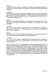 Frage 5: In wie vielen Fällen wurde ein Lehrstuhl für die Dauer des Berufungsverfahrens ver- treten? Wird in solchen Fällen für den gesamten Zeitraum des Berufungsverfahrens vertreten? zu Frage 5: Mit Erlass vom 25. Juli 2001 wurde die Entscheidung über die Professorenstellenver- tretung auf die Hochschulen übertragen. Im MWFK werden hierzu keine Daten erho- ben. Im Rahmen der für die Beantwortung zur Verfügung stehenden Zeit können kei- ne Fallzahlen vorgelegt werden. Frage 6: Wie lange dauern Berufungsverfahren (vom Zeitpunkt der Ausschreibung bis zur Er- nennung) in der Regel in Brandenburg? Welches sind maximale und minimale Zeiträume? zu Frage 6: Die im Jahr 2006 erfolgreich abgeschlossenen Berufungsverfahren dauerten im Durchschnitt 17 Monate von der Ausschreibung bis zur Ernennung, maximal 28 Mo- nate, minimal 11 Monate. Frage 7: Wie lange ist in der Regel in Brandenburg der Zeitraum von der Ruferteilung bis zur Ernennung? Welches sind maximale und minimale Zeiträume? zu Frage 7: Die im Jahr 2006 erfolgreich abgeschlossenen Berufungsverfahren dauerten im Durchschnitt 4,8 Monate von der Ruferteilung bis zur Ernennung, maximal 7 Monate, minimal 2 Monate. Bei den Fragen 6 und 7 ist zu berücksichtigen, dass die Zahlenangaben keinen hin- reichenden Aufschluss über die tatsächliche Dauer des Berufungsverfahrens an der Hochschule und im MWFK geben, da Berufungen in der Regel zum Beginn des je- weiligen Semesters erfolgen. Ebenso ist zu berücksichtigen, dass zeitliche Verzöge- rungen bei der Besetzung einer Professur unterschiedliche Ursachen haben können, wie z.B. die Klärung der Art des Dienstverhältnisses, Dauer der Berufungsverhand- lungen mit einzuräumenden Entscheidungsfristen, einzuhaltende Kündigungsfristen des Rufinhabers oder ressortübergreifende Abstimmungsvorgänge innerhalb der Landesregierung. Seite 3 von 3