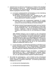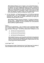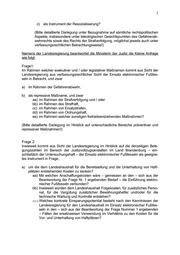 4 (Bitte detaillierte Darlegung, auch im Vergleich zu den im Bundesland Hessen – im Zusammenhang mit dem Einsatz elektronischer Fußfesseln – entstandenen Anschaffungs- und jährlich entstehenden Folgekosten; bei Beantwortung der Frage 2 a) cc) bitte Darlegung der Kosten der Anschaffung und des Einsatzes elektronischer Fußfesseln im synoptischen Vergleich zu den Kosten der Haft- plätze nach absoluten und relativen Zahlen, und zwar aufgeschlüsselt nach den für die unterschiedlichen Haftformen entstehenden Kosten pro Tag!) b) um dem Sicherheits- und Strafverfolgungsbedürfnis der Bevölkerung gegenüber Schwerstkriminellen – wie z. B. Sexualstraftätern – insbesondere nach deren Haft- verbüßung bzw. während Zeiten der Strafhaft (insbesondere bei Freigang bzw. Hafturlaub) verbessert gerecht zu werden? (Bitte detaillierte Darlegung, bezogen auf sämtliche – im Ergebnis der Beantwor- tung von Frage 1 – verfassungsrechtlich zulässigen Möglichkeiten des Einsat- zes elektronischer Fußfesseln, und zwar im präventiven und / oder repressiven Bereich staatlicher Eingriffsverwaltung!) Frage 3: Wie schätzt die Landesregierung – auch im Hinblick auf die im Bundesland Hessen bzw. in anderen Staaten im Zusammenhang mit dem Einsatz elektronischer Fußfes- seln vorhandenen Erfahrungen - die Einführung elektronischer Fußfesseln ein, und zwar a) als Instrument der Spezialprävention, b) als Instrument der Generalprävention, c) als Instrument der Resozialisierung? (Bitte detaillierte Darlegung unter Bezugnahme auf sämtliche rechtspolitischen Aspekte, insbesondere unter teleologischen Gesichtspunkten des Gefahrenab- wehrrechts sowie des Rechts der Strafverfolgung, möglichst jeweils auch unter verfassungsrechtlichen Betrachtungsweise!) zu den Fragen 1 bis 3: Die Landesregierung erwägt in Übereinstimmung mit den Regierungen der meisten an- deren Bundesländer derzeit nicht den Einsatz der „elektronischen Fußfessel“.