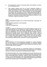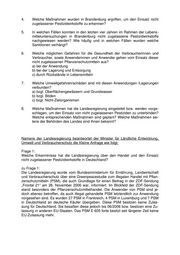 b) Bei sachgerechter Lagerung / Entsorgung gehen keine Gefahren für Anwen- der und Verbraucher aus. c) Über mögliche Gefahren durch die zu Frage 5 gemachten Angaben zu Höchstmengenüberschreitungen an Rückständen von PSM und deren Wirk- stoffen ohne Zulassung im Jahr 2006 in Deutschland können keine gesicher- ten Aussagen getroffen werden. Konkrete Angaben über Gesundheitsgefähr- dungen liegen der Landesregierung nicht vor. Rückstandshöchstmengen wer- den mit einem erhöhten Sicherheitszuschlag versehen, um aufgrund des vor- beugenden Verbraucherschutzes mögliche gesundheitliche Gefahren für den Verbraucher möglichst ausschließen zu können. Frage 7: Welche Umweltgefahren/schäden sind mit diesen Anwendungen /Lagerungen ver- bunden? a) bzgl. Oberflächengewässern und Grundwasser b) bzgl. Böden c) bzgl. Nicht-Zielorganismen zu Frage 7: Inwiefern von verbotenen PSM Gefahren für die Umwelt ausgehen, ist stark vom ein- zelnen Mittel abhängig. Von der fachgerechten Lagerung verbotener PSM geht, ver- glichen mit zugelassenen PSM, keine erhöhte Umweltgefahr aus, sofern die Behält- nisse dicht verschlossen sind und die Grundsätze der guten fachlichen Praxis im Pflanzenschutz beachtet werden. Davon ausgehend, dass nunmehr verbotene Pflanzenschutzmittel-Wirkstoffe wie Lenacil oder Parathionmethyl (siehe zu Frage 2) bis vor wenigen Jahren legal eingesetzt werden konnten und es sich wie beschrie- ben um einzelne Verstöße handelt, ist zu erwarten, dass die aus aktueller Anwen- dung resultierende Gefährdung der Umwelt eher als gering eingeschätzt wird. Frage 8: Welche Maßnahmen hat die Landesregierung eingeleitet bzw. werden vorgeschla- gen, um den Einsatz von nicht zugelassenen Pestiziden zu unterbinden? Welche entsprechenden Maßnahmen sind geplant? Welche Maßnahmen seitens der Behör- den des Landes sind Ihnen bekannt? zu Frage 8: Es existiert, wie bereits angemerkt, ein umfassendes Programm an Fachrechtskon- trollen im Pflanzenschutz im Land Brandenburg. Bei Bekanntwerden von Problemen wird durch das Setzen entsprechender Kontrollschwerpunkte reagiert. Der Pflanzenschutzdienst des Landes Brandenburg wird bei der Planung der Kon- trollen für das kommende Jahr gezielt auf Pflanzenschutzmittel-Verkehrskontrollen sowie Anwendungskontrollen fokussieren. Weiterhin werden Anstrengungen unter- nommen, um die Zusammenarbeit mit der Lebensmittelüberwachung zu verbessern, um ausgehend von den Ergebnissen der Lebensmitteluntersuchung gezielt Anhalts- punkte für die Überwachung der Primärproduktion zu erhalten.