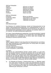 Frage 3: Welche in Deutschland zugelassenen Mittel bzw. Wirkstoffe werden nach Ihren Kenntnissen in Kulturen in Brandenburg eingesetzt, für die diese nicht zugelassen sind? In welchen Mengen erfolgt dies? Wer sind die Ihnen bekannten Inverkehrbrin- ger? Wer sind Ihnen bekannte Verwender? Welche Kulturen /Regionen sind davon betroffen? zu Frage 3: Die Zulassungssituation von PSM ist in Deutschland sehr kompliziert und ständigen Veränderungen unterworfen. Trotz der umfassenden Informationen durch den Pflan- zenschutzdienst kann es vorkommen, dass Landwirte und Gärtner ein zugelassenes PSM in einer Kultur einsetzen, in der es nicht oder nicht mehr zugelassen oder ge- nehmigt ist. Dennoch ist die Zahl solcher Verstöße gegen die Indikationszulassung in Brandenburg nach Kenntnis des Pflanzenschutzdienstes gering. 2004 gab es in die- ser Hinsicht 9 Beanstandungen bei 113 Kontrollen, 2005 eine Beanstandung bei 76 Kontrollen. In 2006 ist bisher ein Fall bekannt. Die Frage nach den Inverkehrbringern der fraglichen PSM erübrigt sich an dieser Stelle, da diese zugelassen sind und entsprechend legal gehandelt werden dürfen. Frage 4: Welche Maßnahmen wurden in Brandenburg ergriffen, um den Einsatz nicht zugel- assener Pestizidwirkstoffe zu erkennen? zu Frage 4: Es gibt seit mehreren Jahren ein abgestimmtes Bund-Länder-Kontrollprogramm, nach dem auch in Brandenburg gearbeitet wird (siehe zu Frage 2). 2006 wurden in Brandenburg beispielsweise Kontrollen in insgesamt 380 landwirtschaftlichen und gärtnerischen Unternehmen durchgeführt. Dazu kamen 40 Kontrollen in Handelsein- richtungen. Es wird darauf geachtet, dass alle relevanten Kontrolltatbestände nach Pflanzenschutzrecht abgedeckt werden. Besondere Aufmerksamkeit erhalten ver- schiedene auf Bundesebene abgestimmte Kontrollschwerpunkte wie das Monitoring bei Beerenobst oder die Kontrollen der Anwendungsbestimmungen von PSM zum Schutz von Oberflächengewässern. Frage 5: In welchen Fällen konnten in den letzten vier Jahren im Rahmen der Lebensmittelun- tersuchungen in Brandenburg nicht zugelassene Pestizidwirkstoffe nachgewiesen werden? Wie häufig und in welchen Fällen wurden welche Sanktionen verhängt? zu Frage 5: Folgende Ergebnisse wurden im Rahmen der Lebensmittelüberwachung zu nicht zu- gelassenen PSM erlangt (Höchstmengenüberschreitungen an Rückständen von PSM; Wirkstoffe von PSM ohne Zulassung im Jahr 2006 in Deutschland): 2002 bei 2 Wirkstoffen Acephat Aprikosen aus Spanien Fenvalerat Grüner Tee aus China