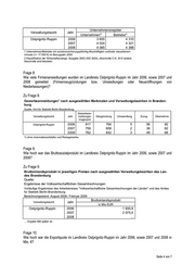 Verwaltungsbezirk Jahr Anzahl Ostprignitz-Ruppin 2006 • 2007 10 678 2008 10 524 April 2009 10 721 1 Daten aus der Arbeitsmarktstatistik der Bundesagentur für Arbeit • Zahl unbekannt Frage 14: Wie hoch war das gesamte Haushaltsvolumen (Vermögens- und Verwaltungshaushalt, sofern noch keine Doppik) Landkreis Ostprignitz-Ruppin im Jahr 2006, sowie 2007 und 2008? Frage 15: Wie hoch waren die im Haushalt ausgewiesenen Kredite? Zu Frage 14 und 15: Öffentliche Haushalte des Landes Brandenburg nach ausgewählten Verwaltungsbezirken Quelle: Amt für Statistik Berlin-Brandenburg 2006, 2007 Jahresrechnungsstatistik der Gemeinden und Gemeindeverbände, Schuldenstatistik 2008 Vierteljährliche Kassenstatistik, Schuldenstatistik 1) 2) 2006 2007 2008 Ostprignitz-Ruppin in 1000 EUR Frage 14 Einnahmen insgesamt Landkreis insgesamt 403.795 (421.679) (426.016) dar. Kreisverwaltung 236.011 x x Ausgaben insgesamt Landkreis insgesamt 456.844 (422.956) (405.963) dar. Kreisverwaltung 280.019 x x Frage 15 Schulden insgesamt, Stand am 31.12. Landkreis insgesamt 105.926 104.232 94.831 dar. Kreisverwaltung 22.569 21.357 20.117 1) im Jahr 2007 ist im Landkreis Ostprignitz-Ruppin die Kreisverwaltung mit doppischer Buchführung enthalten, die doppischen Schlüssel wurden auf die kamerale Systematik umgesetzt 2) im Jahr 2008 sind im Landkreis Ostprignitz-Ruppin 1 Gemeinde und die Kreisverwaltung mit doppischer Buchführung enthal- ten, die doppischen Schlüssel wurden auf die kamerale Systematik umgesetzt Frage 16: Hat der Landkreis Ostprignitz-Ruppin im Jahr 2006, 2007, 2008 oder 2009 Mittel der Landesregierung zur Haushaltskonsolidierung erhalten? Wenn ja: Wann und in welcher Höhe? Frage 17: Hat der Landkreis aktuell ein Haushaltsicherungskonzept und befindet sich in der Haushaltssicherung? Frage 18: Wie hoch ist die Kreisumlage im Landkreis Ostprignitz-Ruppin in % im Jahr 2006, 2007, 2008 und 2009? Seite 6 von 7