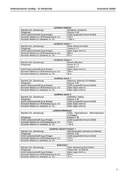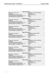 Niedersächsischer Landtag – 18. Wahlperiode Drucksache 18/5826 Region Hannover 1 Standort (Ort, Gemarkung): NEUSTADT A. RBGE, SUTTORF Anlagentyp: VESTAS V 112 Anteil-Carbonwerkstoff (kg je Anlage) Daten liegen nicht vor Kürzester Abstand zur Wohnbebauung ca. (m) 498 m Kürzester Abstand zu Gewässer ca. (m) 665 m Region Hannover 2 Standort (Ort, Gemarkung): NEUSTADT A. RBGE, NÖPKE Anlagentyp: NORDEX N 60 Anteil-Carbonwerkstoff (kg je Anlage) Daten liegen nicht vor Kürzester Abstand zur Wohnbebauung ca. (m) 968 m Kürzester Abstand zu Gewässer ca. (m) 683 m Region Hannover 3 Standort (Ort, Gemarkung): NEUSTADT A. RBGE, NÖPKE Anlagentyp: NORDEX N 60 Anteil-Carbonwerkstoff (kg je Anlage) Daten liegen nicht vor Kürzester Abstand zur Wohnbebauung ca. (m) 704 m Kürzester Abstand zu Gewässer ca. (m) 897 m Region Hannover 4 Standort (Ort, Gemarkung): NEUSTADT A. RBGE, LADERHOLZ Anlagentyp: NORDEX N 60 Anteil-Carbonwerkstoff (kg je Anlage) Daten liegen nicht vor Kürzester Abstand zur Wohnbebauung ca. (m) 566 m Kürzester Abstand zu Gewässer ca. (m) 1.280 m Region Hannover 5 Standort (Ort, Gemarkung): NEUSTADT A. RBGE, LADERHOLZ Anlagentyp: NORDEX N 60 Anteil-Carbonwerkstoff (kg je Anlage) Daten liegen nicht vor Kürzester Abstand zur Wohnbebauung ca. (m) 1.348 m Kürzester Abstand zu Gewässer ca. (m) 1.338 m Region Hannover 6 Standort (Ort, Gemarkung): NEUSTADT A. RBGE, MANDELSLOH Anlagentyp: NORDEX N 60 Anteil-Carbonwerkstoff (kg je Anlage) Daten liegen nicht vor Kürzester Abstand zur Wohnbebauung ca. (m) 376 m Kürzester Abstand zu Gewässer ca. (m) 886 m Region Hannover 7 Standort (Ort, Gemarkung): NEUSTADT A. RBGE, NÖPKE Anlagentyp: NORDEX N 60 Anteil-Carbonwerkstoff (kg je Anlage) Daten liegen nicht vor Kürzester Abstand zur Wohnbebauung ca. (m) 633 m Kürzester Abstand zu Gewässer ca. (m) 1.172 m Region Hannover 8 Standort (Ort, Gemarkung): NEUSTADT A. RBGE, LADERHOLZ Anlagentyp: NORDEX N 60 Anteil-Carbonwerkstoff (kg je Anlage) Daten liegen nicht vor Kürzester Abstand zur Wohnbebauung ca. (m) 1.099 m Kürzester Abstand zu Gewässer ca. (m) 1.511 m 5