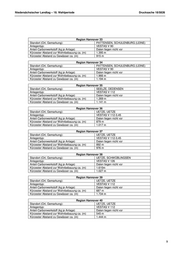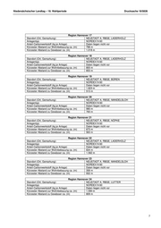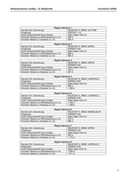 Niedersächsischer Landtag – 18. Wahlperiode Drucksache 18/5826 Region Hannover 17 Standort (Ort, Gemarkung): NEUSTADT A. RBGE, LADERHOLZ Anlagentyp: NORDEX N 60 Anteil-Carbonwerkstoff (kg je Anlage) Daten liegen nicht vor Kürzester Abstand zur Wohnbebauung ca. (m) 798 m Kürzester Abstand zu Gewässer ca. (m) 1.018 m Region Hannover 18 Standort (Ort, Gemarkung): NEUSTADT A. RBGE, LADERHOLZ Anlagentyp: NORDEX N 60 Anteil-Carbonwerkstoff (kg je Anlage) Daten liegen nicht vor Kürzester Abstand zur Wohnbebauung ca. (m) 800 m Kürzester Abstand zu Gewässer ca. (m) 653 m Region Hannover 19 Standort (Ort, Gemarkung): NEUSTADT A. RBGE, BÜREN Anlagentyp: NORDEX N 60 Anteil-Carbonwerkstoff (kg je Anlage) Daten liegen nicht vor Kürzester Abstand zur Wohnbebauung ca. (m) 1.823 m Kürzester Abstand zu Gewässer ca. (m) 513 m Region Hannover 20 Standort (Ort, Gemarkung): NEUSTADT A. RBGE, MANDELSLOH Anlagentyp: NORDEX N 60 Anteil-Carbonwerkstoff (kg je Anlage) Daten liegen nicht vor Kürzester Abstand zur Wohnbebauung ca. (m) 980 m Kürzester Abstand zu Gewässer ca. (m) 760 m Region Hannover 21 Standort (Ort, Gemarkung): NEUSTADT A. RBGE, NÖPKE Anlagentyp: NORDEX N 60 Anteil-Carbonwerkstoff (kg je Anlage) Daten liegen nicht vor Kürzester Abstand zur Wohnbebauung ca. (m) 673 m Kürzester Abstand zu Gewässer ca. (m) 563 m Region Hannover 22 Standort (Ort, Gemarkung): NEUSTADT A. RBGE, LADERHOLZ Anlagentyp: NORDEX N 60 Anteil-Carbonwerkstoff (kg je Anlage) Daten liegen nicht vor Kürzester Abstand zur Wohnbebauung ca. (m) 834 m Kürzester Abstand zu Gewässer ca. (m) 1.582 m Region Hannover 23 Standort (Ort, Gemarkung): NEUSTADT A. RBGE, MANDELSLOH Anlagentyp: NORDEX N 60 Anteil-Carbonwerkstoff (kg je Anlage) Daten liegen nicht vor Kürzester Abstand zur Wohnbebauung ca. (m) 358 m Kürzester Abstand zu Gewässer ca. (m) 932 m Region Hannover 24 Standort (Ort, Gemarkung): NEUSTADT A. RBGE, LUTTER Anlagentyp: NORDEX N 60 Anteil-Carbonwerkstoff (kg je Anlage) Daten liegen nicht vor Kürzester Abstand zur Wohnbebauung ca. (m) 1.590 m Kürzester Abstand zu Gewässer ca. (m) 809 m 7