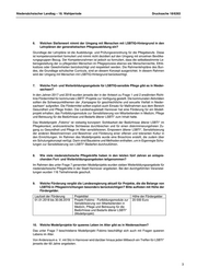 Niedersächsischer Landtag – 18. Wahlperiode Drucksache 18/6263 Lehrinhalte werden. Modellprojekte für eine kultursensible Pflege waren gewünscht.4 Auch im Ab- schlussbericht zur Entwicklung der „Kampagne für sexuelle und geschlechtliche Vielfalt* in Nieder- sachsen“ 5 war die Pflege ein Thema. Es ging und geht auch hier weiterhin um diskriminierungsfreie Pflegeprojekte, in denen LSBTI*-Personen respektvoll und angemessen behandelt werden. 1. Welche Maßnahmen unternimmt die Landesregierung, um die Situation von LSBTIQ in der Pflege zu verbessern? Vonseiten der Landesregierung wird über die Richtlinie über die Gewährung von Zuwendungen zur Förderung von Aktivitäten für den Abbau von Diskriminierungen gleichgeschlechtlich orientierter, trans- oder intergeschlechtlicher Menschen die Möglichkeit geboten, Fördergelder für Projekte zu beantragen. Dabei geht es um die Förderung von Aktivitäten für den Abbau von Diskriminierungen gleichgeschlechtlich orientierter, trans- oder intergeschlechtlicher Menschen, um die Wahrnehmung und Wertschätzung gegenüber der Vielfalt der sexuellen Orientierung und Geschlechter zu steigern, vergleichbare Entwicklungschancen für alle Menschen unabhängig von ihrer sexuellen Orientierung oder geschlechtlichen Identität herzustellen sowie die materiellen Arbeitsbedingungen der Selbsthilfe und Interessenvertretungen von gleichgeschlechtlich orientierten sowie trans- oder intergeschlecht- lichen Menschen zu verbessern. Die Möglichkeit zur Antragstellung schließt auch Maßnahmen, die die Situation von LSBTI* in der Pflege verbessern, ein. 2. Welche Maßnahmen unternimmt die Landesregierung um Diskriminierung und Ausgren- zung von pflegebedürftigen Menschen mit LSBTIQ-Hintergrund vorzubeugen? Im Sinne der in Frage 1 erwähnten Richtlinie sind auch präventive Aktivitäten eingeschlossen. 3. Gibt es im niedersächsischen Gesundheitsministerium und/oder in anderen landeseige- nen Einrichtungen mit Bezug zum Bereich Pflege und Gesundheit Ansprechpartnerinnen und Ansprechpartner für die Belange von LSBTIQ? Wenn ja, welche? Bitte auflisten nach Behörde, Zahl der Angestellten, Zahl der zur Verfügung stehenden Stunden, Aufgaben- bereich der Stelle. Als Querschnittszuständigkeit für die Grundsatzangelegenheiten LSBTI* sowie für Maßnahmen zum Abbau der Diskriminierung lesbischer Frauen, schwuler Männer, Bisexueller, trans- und interge- schlechtlicher Menschen sind im Ministerium für Soziales, Gesundheit und Gleichstellung zwei Per- sonalstellen im Referat 304 vorgesehen. 4. Welche weiteren Stellen für die Belange von Menschen mit LSBTIQ-Hintergrund plant die Landesregierung einzurichten? Derzeit ist nicht geplant, weitere Stellen einzurichten. 5. Wie werden Vertreterinnen und Vertreter von LSBTIQ an gesundheits- und pflegepoliti- schen Entscheidungen beteiligt? Wenn die Belange lesbischer Frauen, schwuler Männer, bisexueller, trans- und intergeschlechtlicher Menschen von gesundheits- und pflegepolitischen Entscheidungen betroffen sind, werden die Inte- ressensvertretungen in die Entscheidungsfindung einbezogen, etwa im Zuge der Verbandsanhörung bei Gesetzgebungsverfahren. 4 Niedersächsischer Landespflegebericht 2015, S. 389/390. 5 Veröffentlichung in 2015. 2