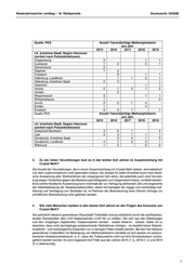 Niedersächsischer Landtag – 18. Wahlperiode Drucksache 18/6208 Quelle: PKS Anzahl bekannt gewordene Fälle mit Methamphetamin pro Jahr 2015 2016 2017 2018 2019 LK, kreisfreie Stadt, Region Hannover (sortiert nach Polizeidirektionen) Osterholz 2 1 Vechta 3 1 2 1 2 Verden 1 Wesermarsch 3 1 1 1 Wilhelmshaven 1 1 4 Aurich 2 3 1 4 Emden 1 3 Emsland 8 6 8 9 13 Grafschaft Bentheim 3 7 3 4 4 Leer 3 2 1 1 1 Osnabrück, Kreisfreie Stadt 2 4 1 5 Osnabrück, Landkreis 4 1 4 4 1 Wittmund 1 3 6 2 Tabelle 4: Anzahl Tatverdächtige Methamphetamin gemäß PKS Quelle: PKS Anzahl Tatverdächtige Methamphetamin pro Jahr 2015 2016 2017 2018 2019 LK, kreisfreie Stadt, Region Hannover (sortiert nach Polizeidirektionen) unbekannt 3 3 12 Braunschweig 6 5 3 3 7 Gifhorn 2 4 1 1 3 Goslar 20 9 7 5 13 Helmstedt 8 5 6 13 10 Peine 5 2 2 1 Salzgitter 1 3 Wolfenbüttel 1 1 2 3 Wolfsburg 3 5 4 3 3 Göttingen 7 8 14 13 21 Hameln-Pyrmont 1 4 2 3 Quelle: PKS Anzahl Tatverdächtige Methamphetamin pro Jahr 2015 2016 2017 2018 2019 LK, kreisfreie Stadt, Region Hannover (sortiert nach Polizeidirektionen) Hildesheim 1 4 3 3 Holzminden 2 1 1 1 Nienburg (Weser) 1 3 Northeim 2 6 2 2 6 Osterode am Harz 14 Schaumburg 2 3 2 1 Hannover, Region 8 11 15 19 27 Celle 4 2 1 1 1 Harburg 4 1 2 2 10 Heidekreis 1 2 4 2 4 Lüchow-Dannenberg 5 1 2 1 Lüneburg 3 2 1 1 2 Rotenburg 2 3 2 4 Stade 5 2 2 1 2 Uelzen 3 1 1 2 Ammerland 1 1 1 6