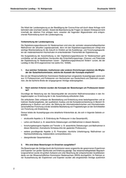 Niedersächsischer Landtag – 18. Wahlperiode Drucksache 18/6419 diskutiert. Ausgangspunkt dafür war jeweils pro eingereichtem Antrag eine Berichterstattung durch zwei Mitglieder des Gremiums. Alle Empfehlungen wurden innerhalb des Auswahlgremiums einstim- mig getroffen. Auf Grundlage dieser Empfehlungen hat MWK die Förderentscheidung getroffen. 4. Gibt es ein Protokoll zur Beschlussfassung des Gremiums? Falls ja, bitte das Protokoll anfügen. Die WKN hat dem MWK das Ergebnis des Auswahlverfahrens übermittelt; ein Protokoll der Gut- achterkommissionssitzung liegt nicht vor. 5. Inwiefern wurde die Grundlagenforschung berücksichtigt? Bitte nach einzelnen Profes- suren aufschlüsseln. Wie bereits in der Vorbemerkung und bei der Antwort der Landesregierung zu Frage 2 aufgezeigt, war eines der wesentlichen Ziele der Ausschreibung neben der Stärkung der Lehre die nachhaltige Stärkung der Forschung zu Digitalisierung in Niedersachsen. Der besondere Fokus lag im Rahmen der Ausschreibung auf der informationstechnischen und informationswissenschaftlichen Forschung. Dabei wurde eine Gleichbehandlung von Grundlagenforschung und Anwendungsforschung vorge- nommen, da sowohl die niedersächsischen Universitäten als auch Fachhochschulen antragsberech- tigt waren. Grundlagen- bzw. anwendungsorientierte Forschungsansätze finden sich daher in allen Konzepten. Die antragsstellenden Hochschulen haben mittels Profilpapieren der geplanten Profes- suren Aussagen zur Denomination, Forschungs- und Arbeitsschwerpunkten der einzelnen geplanten Professuren getroffen. 6. Plant die Landesregierung die Einrichtung von Digitalisierungsprofessuren für die Lehre? Alle Digitalisierungsprofessuren sind auf Dauer angelegte, vollwertige Professuren, insofern gehören zu ihren Aufgaben sowohl Forschung als auch Lehre. Reine Lehr-Professuren im Rahmen der Digi- talisierungsprofessuren sind nicht vorgesehen. 7. Plant die Landesregierung die Unterstützung der Grundlagenforschung durch Digitali- sierungsprofessuren? Ergänzend zu der Antwort der Landesregierung zu Frage 5 ist zu diesem Punkt anzumerken, dass eines der Ziele der Digitalisierungsprofessuren ist, dass sich die Digitalisierungsprofessuren in das Zentrum für digitale Innovationen Niedersachsen (www.zdin.de) als wichtiges forschendes Netzwerk zur Digitalisierung einbringen sollen. 8. Ist die Unterstützung weiterer Digitalisierungsprofessuren durch Ausstattungsmittel aus dem Niedersächsischen Vorab geplant? 9. Wie sieht der Zeitplan für die Einrichtung weiterer Digitalisierungsprofessuren aus? Die Fragen 8 und 9 werden zusammen beantwortet. Die in der Ausschreibung vorgesehenen bis zu 50 Digitalisierungsprofessuren werden mit bis zu 42 Millionen Euro Mitteln für ergänzende wissenschaftliche Ausstattung aus dem Niedersächsischen Vorab unterstützt. Angesichts der COVID-19-Pandemie und der akuten Auswirkungen auf den Hochschulbetrieb wird gegenwärtig geprüft, in welchem Modus und Zeithorizont die Einrichtung der nach der Auswahlent- scheidung im November 2019 bisher noch nicht vergebenen bis zu zehn weiteren Digitalisierungs- professuren durchgeführt werden kann. Die weitere Einrichtung von Digitalisierungs- und/oder KI- Professuren hängt von den weiteren finanziellen Rahmenbedingungen ab. (Verteilt am 19.05.2020) 3