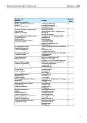 Niedersächsischer Landtag – 18. Wahlperiode Drucksache 18/6058 Bezeichnung/ Deponie- Standort/ Betreiber klasse Stadt bzw. Landkreis Siedlungsabfalldeponie Bornum / Abfallwirtschaftsbetrieb II Börßum / Landkreis Wolfenbüttel Landkreis Wolfenbüttel In den Schönen Morgen 1 38300 Wolfenbüttel Siedlungsabfalldeponie Watenbüttel / Stadt Braunschweig II Braunschweig / Stadtentwässerung und Abfallwirtschaft Stadt Braunschweig Bohlweg 30 38100 Braunschweig Siedlungsabfalldeponie Diebesstieg / Entsorgungszentrum Salzgitter GmbH II Salzgitter-Heerte / Diebesstieg 50 Stadt Salzgitter 38229 Salzgitter Zentraldeponie Blankenhagen / Landkreis Northeim II Landkreis Northeim Kreisabfallwirtschaft Matthias-Grünewald-Str. 22 37154 Northeim Zentraldeponie Heinde / Zweckverband Abfallwirtschaft Hildesheim II Stadt Bad Salzdetfurth / (ZAH) Landkreis Hildesheim Bahnhofsallee 36 31162 Bad Salzdetfurth Zentraldeponie Bassum / AbfallWirtschafts-Gesellschaft mbH (AWG) II Landkreis Diepholz Klövenhausen 20 27209 Bassum Deponie Kolenfeld / Zweckverband Abfallwirtschaft II Region Hannover Region Hannover (aha) Karl-Wiechert-Allee 60 c 30625 Hannover Deponie Sachsenhagen / Abfallwirtschaftsgesellschaft Landkreis II Landkreis Schaumburg Schaumburg mbH (AWS) Obere Wallstr. 3 31655 Stadthagen Siedlungsabfalldeponie Borg / Abfallwirtschaftsbetrieb II Rosche, Borg / Landkreis Uelzen Landkreis Uelzen Wendlandstr. 8 29525 Uelzen Siedlungsabfalldeponie Landkreis Stade II Wischhafen II / Am Sande 2 Landkreis Stade 21682 Stade Siedlungsabfalldeponie Lüneburg / Gesellschaft für Abfallwirtschaft Lüneburg II Bardowick / Adendorfer Weg 7 Landkreis Lüneburg 21357 Bardowick Siedlungsabfalldeponie Hillern / Abfallwirtschaft II Hillern, Heber / Heidekreis AöR Landkreis Heidekreis Bornemannstr. 4 29614 Soltau Siedlungsabfalldeponie Abfallwirtschaftsbetrieb II Mansie II / Landkreis Ammerland Stadt Westerstede / Ammerlandallee 12 Landkreis Ammerland 26655 Westerstede Siedlungsabfalldeponie Sedelsberg / Landkreis Cloppenburg II Gemeinde Saterland / Eschstr. 29 Landkreis Cloppenburg 49661 Cloppenburg Siedlungsabfalldeponie Dörpen / Abfallwirtschaftsbetrieb II Landkreis Emsland Landkreis Emsland Ordeniederung 1 49716 Meppen 3