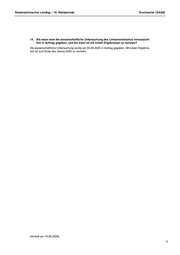 Niedersächsischer Landtag – 18. Wahlperiode Drucksache 18/6469 14. Bis wann wird die wissenschaftliche Untersuchung des Linksextremismus voraussicht- lich in Auftrag gegeben, und bis wann ist mit ersten Ergebnissen zu rechnen? Die wissenschaftliche Untersuchung wurde am 04.05.2020 in Auftrag gegeben. Mit ersten Ergebnis- sen ist zum Ende des Jahres 2020 zu rechnen. (Verteilt am 19.05.2020) 5