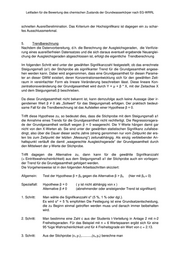 Leitfaden für die Bewertung des chemischen Zustands der Grundwasserkörper nach EG-WRRL schnellen Ausreißerelimination. Das Kriterium der Hochsignifikanz ist dagegen ein zu schar- fes Ausschlussmerkmal. 5. Trendberechnung Nachdem die Datenvorbereitung, d.h. die Berechnung der Ausgleichsgeraden, die Verifizie- rung eines ausreißerfreien Datensatzes und die sich daraus eventuell ergebende Neuanglei- chung der Ausgleichsgeraden abgeschlossen ist, erfolgt die eigentliche Trendberechnung Im folgenden Schritt wird unter der gewählten Signifikanzzahl festgestellt, ob das errechnete Steigungsmaß (a1) der Stichprobe als signifikanter Trend für die Grundgesamtheit angese- hen werden kann. Dabei wird angenommen, dass eine Grundgesamtheit für diesen Parame- ter an dieser GWM existiert, deren Konzentrationsentwicklung sich für den gewählten Zeit- raum in vereinfachter Form als lineare Veränderung beschreiben lässt. Diese lineare Kon- zentrationsveränderung der Grundgesamtheit wird durch Y = µ + β * X, mit der Zeitachse X und dem Steigungsmaß β beschrieben. Da diese Grundgesamtheit nicht bekannt ist, kann demzufolge auch keine Aussage über ir- gendeinen Wert β ≠ 0 als „Sollwert“ für das Steigungsmaß erfolgen. Der praktisch bedeut- same Fall für die Trendberechnung ist das Aufstellen einer Hypothese β = 0. Trifft diese Hypothese zu, so bedeutet dies, dass die Stichprobe mit dem Steigungsmaß a1 die Annahme eines Trends für die Grundgesamtheit nicht rechtfertigt. Die Regressionsgera- de der Grundgesamtheit verläuft wegen β = 0 waagerecht. Die Y-Werte hängen damit gar nicht von den X-Werten ab. Sie sind unter der gewählten statistischen Signifikanz zufallsbe- dingt, also über die Dauer dieser sechs Jahre (streng genommen nur vom Zeitpunkt der ers- ten bis zum Zeitpunkt der letzten „Messung“) zeitunabhängig. Als einzig verbleibender An- haltspunkt verläuft die damit „waagerechte Ausgleichsgerade“ der Grundgesamtheit durch den Mittelwert der y-Werte der Stichprobe. Trifft dagegen die Alternative zu, dann kann für die gewählte Signifikanzzahl (= Eintrittswahrscheinlichkeit) aus dem Steigungsmaß a1 der Stichprobe auch ein vorliegen- der Trend für die Grundgesamtheit gefolgert werden. Die Vorgehensweise ist in den folgenden Arbeitsschritten skizziert: Allgemein: Test der Hypothese β = β0 gegen die Alternative β > β0 (hier mit β0 = 0) Spezialfall: Hypothese β = 0 ( y ist nicht abhängig von x ) Alternative β ≠ 0 (abnehmender oder ansteigender Trend ist signifikant) 1. Schritt: Man wähle die Signifikanzzahl α* (5 %, 1 % oder dgl.). Es wird α* = 5 % empfohlen Die Festlegung ist eine Grundsatzentscheidung, die zu Beginn einmal getroffen werden muss und danach immer beibehalten wird. 2. Schritt: Man bestimme eine Zahl c aus der Students t-Verteilung in Anlage 2 mit n-2 Freiheitsgeraden. Für das Beispiel mit n = 6 Wertepaaren ergibt sich für eine 95 %ige Wahrscheinlichkeit und für 4 Freiheitsgrade ein Wert von c = 2.13. 3. Schritt: Aus der Stichprobe (x1,y1),..........,(xn,yn) berechne man