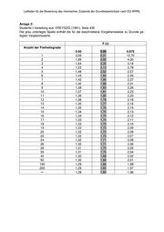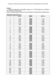 Leitfaden für die Bewertung des chemischen Zustands der Grundwasserkörper nach EG-WRRL Anlage 2: Students t-Verteilung aus: KREYSZIG (1991), Seite 435 Die grau unterlegte Spalte enthält die für die beschriebene Vorgehensweise zu Grunde ge- legten Vergleichswerte. F (z) Anzahl der Freiheitsgrade 0.90 0.95 0.975 1 3,08 6,31 12,70 2 1,89 2,92 4,30 3 1,64 2,35 3,18 4 1,53 2,13 2,78 5 1,48 2,02 2,57 6 1,44 1,94 2,45 7 1,42 1,90 2,37 8 1,40 1,86 2,31 9 1,38 1,83 2,26 10 1,37 1,81 2,23 11 1,36 1,80 2,20 12 1,36 1,78 2,18 13 1,35 1,77 2,16 14 1,35 1,76 2,15 15 1,34 1,75 2,13 16 1,34 1,75 2,12 17 1,33 1,74 2,11 18 1,33 1,73 2,10 19 1,33 1,73 2,09 20 1,33 1,73 2,09 22 1,32 1,72 2,07 24 1,32 1,71 2,06 26 1,32 1,71 2,06 28 1,31 1,70 2,05 30 1,31 1,70 2,04 40 1,30 1,68 2,02 50 1,30 1,68 2,01 100 1,29 1,66 1,98 200 1,29 1,65 1,97 ∞ 1,28 1,65 1,96