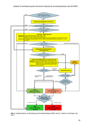 Leitfaden für die Bewertung des chemischen Zustands der Grundwasserkörper nach EG-WRRL NEIN Überschreitung der SW an mind. 1 Messstelle im GWK? JA Zuordnung der Messstelle zur TF/zum TR NEIN Geogener Hintergrundwert überschritten? JA NEIN Mind. 5 Mst. innerhalb der TF/des TR JA Prüfschritt 1 (WRRL-Messnetz) Kriterium 1: mehrere Überschreitungen (mind. 3 Mst. > SW) Kriterium 2: Mittelwert der flachen Mst. (Lockergestein) oder Mittelwert der Mst. vergleichbarer hydrostatischer Einheiten (Festgestein) in der TF/des TR > SW Kriterium 3: Anthropogene Quelle bekannt? Wenn ja: Mittelwert der potentiellen NO3-Konzetration > 75 mg/l (bei Nitrat) KEIN KRITERIUM ERFÜLLT MINDESTENS 2 KRITERIEN ERFÜLLT Kriterien erfüllt? 1 KRITERIUM ERFÜLLT Sachdienliche Zusatzinformation Messnetzbeurteilung NEIN Messnetzkriterien erfüllt? JA Prüfschritt 2 (WRRl-Messnetz & Zusatzinformation) Kriterium 1: mehrere Überschreitungen (mind. 3 Mst. > SW) Kriterium 2: Mittelwert der flachen Mst. (Lockergestein) oder Ausbau Mittelwert der Mst. vergleichbarer hydrostatischer Monitoring Einheiten (Festgestein) in der TF/des TR > SW Kriterium 3: siehe Prüfschritt 1 1 KRITERIUM ERFÜLLT Kriterien erfüllt? Einzelfallbetrachtung NEIN KEIN KRITERIUM MINDESTENS 2 TF/TR beurteilbar? ERFÜLLT KRITERIEN ERFÜLLT JA Signifikante NEIN Gefährdung der Um- welt durch TF/TR? JA TF/TR: TF/TR: keine signifikante signifikante Gefährdung Gefährdung der Umwelt der Umwelt Flächenanteil signifikant gefährdeter TF/TR am GWK < 33 % oder < 25 km² > 33 % oder > 25 km² GWK: GWK: guter chemischer schlechter chemischer Zustand Zustand Abb. 2: Vorgehensweise zur Beurteilung der Grundwasserkörper (GWK) nach § 7, Absatz 2 und Anlage 4 der GrwV 10
