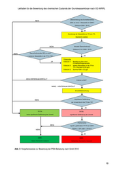 Leitfaden für die Bewertung des chemischen Zustands der Grundwasserkörper nach EG-WRRL Überschreitung des Schwellenwertes NEIN (SW) an mind. 1 Messstelle im GWK? (Zeitraum 2004 - 2013) JA Zuordnung der Messstelle zur TF/zum TR, Steckbrief erstellen NEIN Aktuelle Überschreitung? (Zeitraum 2 HJ. 2009 - 2013) Überschreitung des SW an mind. NEIN 1 weiteren Messstelle in der TF/im TR? JA Prüfschritte JA Kriterium 1: Bestätigung über mind. 2 Untersuchungsintervalle Kriterium 2: weitere Messstellen in der TF/im TR > Warnwert (0,05 µg/l) Kriterium 3: Summe PSM > 0,5 µg/l KEIN KRITERIUM ERFÜLLT Kriterien erfüllt? MIND. 1 KRITERIUM ERFÜLLT Einzelfallbetrachtung NEIN Signifikante Gefährdung der Umwelt durch die TF/den TR? JA TF/TR: TF/TR: keine signifikante Gefährdung der Umwelt signifikante Gefährdung der Umwelt Flächenanteil NEIN signifik. gefährdeter TF/TR am GWK Fläche: > 33% oder > 25 km²? NEIN JA GWK: GWK: Guter chemischer Zustand Schlechter chemischer Zustand Abb. 3: Vorgehensweise zur Bewertung der PSM-Belastung nach GrwV 2010 18