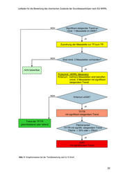 Leitfaden für die Bewertung des chemischen Zustands der Grundwasserkörper nach EG-WRRL „Signifikanter und anhaltender steigender Trend“ bezeichnet jede statistisch signifikante und ökologisch bedeutsame Zunahme der Konzentration eines Schadstoffs im Grundwasser, für den eine Trendumkehr als notwendig erkannt wird (§ 1, Abs. 3 GrwV). Die Ermittlung der nicht nur statistischen, sondern auch ökologisch bedeutsamen Zunahme der Konzentration eines Schadstoffs erfolgt gemäß Abstimmung in LAWA-AG in Anlehnung an die Vorgehens- weise zur Bewertung des chemischen Zustands. Ein signifikant ansteigender Trend ist dann maßnahmenrelevant, wenn die Schadstoffkon- zentration einer Grundwassermessstelle über 75 % des Schwellenwertes liegt und wenn die von dieser oder mehreren Messstellen repräsentierte Fläche > 33 % oder 25 km² des Grundwasserkörper ist. (analog zur Prüfung nach Kap. 4.2). Vorgehensweise und Bewertung der Trendanalyse sind in Anlage II des vorliegenden Leitfa- dens ausführlich erläutert und in der folgenden Abbildung 4 schematisch dargestellt. 21