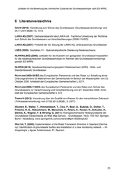 Leitfaden für die Bewertung des chemischen Zustands der Grundwasserkörper nach EG-WRRL 6 Literaturverzeichnis GRWV (2010): Verordnung zum Schutz des Grundwassers (Grundwasserverordnung) vom 09.11.2010 BGBl. I S. 1513 LAWA AG (2007): Sachstandsbericht des LAWA-UA - Fachliche Umsetzung der Richtlinie zum Schutz des Grundwassers vor Verschlechterungen (2006//118/EG) LAWA AG (2007): Protokoll der 53. Sitzung der LAWA AG, Unterausschuss Grundwasser LBEG (2005): Geofakten 21 - Hydrostratigrafische Gliederung Niedersachsens NLWKN/LBEG (2006): Leitfaden für die Auswahl von geeigneten Grundwassermessstellen für die niedersächsischen Grundwasserkörper im Rahmen des Grundwassermonitorings gemäß EG-WRRL NLWKN (2013): Gewässerüberwachungssystem Niedersachsen (GÜN) - Güte- und Standsmessnetz Grundwasser RICHTLINIE 2000//60/EG des Europäischen Parlaments und des Rates zur Schaffung eines Ordnungsrahmens für Maßnahmen der Gemeinschaft im Bereich der Wasserpolitik vom 23. Oktober 2000: Amtsblatt der Europäischen Gemeinschaften L 327/1. RICHTLINIE 2006//118/EG des Europäischen Parlaments und des Rates zum Schutz des Grundwassers vor Verschmutzung und Verschlechterung vom 27. Dezember 2006: Amts- blatt der Europäischen Gemeinschaften L 372. TRINKWV (2013): Verordnung über die Qualität von Wasser für den menschlichen Gebrauch (Trinkwasserverordnung) vom 07.08.2013 (BGBl., S. 2977) WAGNER, B., Walter, T., Himmelsbach, T., Clos, P., Beer, A., Budziak, D., Dreher, T., Fritsche, H.-G., Hübschmann, M., Marczinek, S., Peters, A., Poeser, H., Schuster, H., Steinel, A., Wagner, F. & Wirsing, G. (2011): Hydrogeochemische Hintergrundwerte der Grundwässer Deutschlands als Web Map Service. - Grundwasser, 16(3): 155-162; Springer, Berlin / Heidelberg. www.springerlink.com/content/e88pm153254q4u52 WALTER, T. (2005): Implementation of the Water Framework Directive in Saarland (Germa- ny): Identification of groundwater bodies and installation of a new monitoring network. – Hi- drogeología y Aguas Subterraneas, 21; Spanien 23