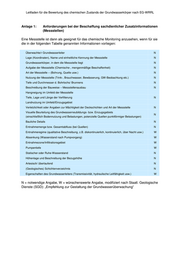 Leitfaden für die Bewertung des chemischen Zustands der Grundwasserkörper nach EG-WRRL Anlage 1: Anforderungen bei der Beschaffung sachdienlicher Zusatzinformationen (Messstellen) Eine Messstelle ist dann als geeignet für das chemische Monitoring anzusehen, wenn für sie die in der folgenden Tabelle genannten Informationen vorliegen: Überwachte/r Grundwasserleiter N Lage (Koordinaten), Name und einheitliche Kennung der Messstelle N Grundwasserkörper, in dem die Messstelle liegt N Aufgabe der Messstelle (Chemische-, mengenmäßige Beschaffenheit) N Art der Messstelle – (Bohrung, Quelle usw.) N Nutzung der Messstelle (Trink-, Brauchwasser, Bewässerung, GW-Beobachtung etc.) N Tiefe und Durchmesser d. Bohrlochs/ Brunnens N Beschreibung der Bauweise – Messstellenausbau N Hangneigung im Umfeld der Messstelle Tiefe, Lage und Länge der Verfilterung N Landnutzung im Umfeld/Einzugsgebiet Verletzlichkeit oder Angaben zur Mächtigkeit der Deckschichten und Art der Messstelle N Visuelle Beurteilung des Grundwasserneubildungs- bzw. Einzugsgebiets N (einschließlich Bodennutzung und Belastungen, potenzielle Quellen punktförmiger Belastungen) Bauliche Details N Entnahmemenge bzw. Gesamtabfluss (bei Quellen) N Entnahmeregime (qualitative Beschreibung, z.B. diskontinuierlich, kontinuierlich, über Nacht usw.) W Absenkung (Wasserstand nach Pumpvorgang) W Entnahmezone/Infiltrationsgebiet W Pumpentiefe W Statischer oder Ruhe-Wasserstand N Höhenlage und Beschreibung der Bezugshöhe N Artesisch/ überlaufend N (Geologisches) Schichtenverzeichnis N Eigenschaften des Grundwasserleiters (Transmissivität, hydraulische Leitfähigkeit usw.) W N = notwendige Angabe, W = wünschenswerte Angabe, modifiziert nach Staatl. Geologische Dienste (SGD): „Empfehlung zur Gestaltung der Grundwasserüberwachung“