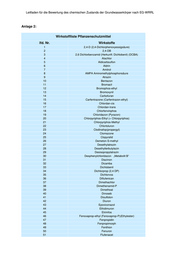 Leitfaden für die Bewertung des chemischen Zustands der Grundwasserkörper nach EG-WRRL Anlage 2: Wirkstoffliste Pflanzenschutzmittel lfd. Nr. Wirkstoffe 1 2,4-D (2,4-Dichlorphenoxyessigsäure) 2 2,4-DB 3 2,6 Dichlorbenzamid (Herkunft: Dichlobenil) (DCBA) 4 Alachlor 5 Aldicarbsulfon 6 Aldrin 7 Amitrol 8 AMPA Aminomethylphosphonsäure 9 Atrazin 10 Bentazon 11 Bromacil 12 Bromophos-ethyl 13 Bromoxynil 14 Carbofuran 15 Carfentrazone (Carfentrazon-ethyl) 16 Chlordan-cis 17 Chlordan-trans 18 Chlorfenvinphos 19 Chloridazon (Pyrazon) 20 Chlorpyriphos-Ethyl (= Chlorpyriphos) 21 Chlorpyriphos-Methyl 22 Chlortoluron 23 Clodinafop(propargyl) 24 Clomazone 25 Clopyralid 26 Demeton-S-methyl 27 Desethylatrazin 28 Desethylterbutylazin 29 Desisopropylatrazin 30 Desphenylchloridazon „Metabolit B“ 31 Diazinon 32 Dicamba 33 Dichlobenil 34 Dichlorprop (2,4 DP) 35 Dichlorvos 36 Diflufenican 37 Dimethachlor 38 Dimethenamid-P 39 Dimethoat 40 Dinoseb 41 Disulfoton 42 Diuron 43 Epoxiconazol 44 Ethidimuron 45 Etrimfos 46 Fenoxaprop-ethyl (Fenoxaprop-P)(Ethylester) 47 Fenpropidin 48 Fenpropimorph 49 Fenthion 50 Fenuron 51 Flufenacet
