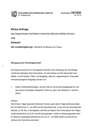 Drucksache 16/1630 Schleswig-Holsteinischer Landtag - 16. Wahlperiode Soweit sich Kreis und Gemeinde nicht anders verständigen, sind auch die mit der Schule verbundenen Kreditverpflichtungen auf den neuen Träger zu übertragen. Die Anforderung, einen angemessenen Interessenausgleich herbeizuführen, richtet sich gleichermaßen an beide Parteien. Eine generelle Vorgabe des Gesetzgebers bzw. des Ministeriums zur Verteilung der Lasten gibt es nicht. Ob die Kreditverpflichtungen ganz, teilweise oder gar nicht übergehen werden, ist eine Frage der Abwägung der regionalen Interessenlagen und Handlungsspielräume von Kreisen und Gemeinden und wird allein auf kommunaler Ebene entschieden. 2. Wer entscheidet über die Höhe dieses Ausgleichs, wenn die beteiligten Schul- träger sich nicht einigen können? Antwort: Die Entscheidung fällt, wie bereits unter Punkt 1 angeführt, in die kommunale Eigen- verantwortung und kann daher nur von den Kommunen getroffen werden. 3. Falls die Landesregierung diese Entscheidung trifft, nach welchen Kriterien geht sie dabei vor? Antwort: Die Landesregierung kann keine Entscheidung anstelle der beteiligten Kommunen treffen. Es obliegt der kommunalen Eigenverantwortung, eine für beide Seiten trag- bare Vertragsbasis zu schaffen. 4. Wird bei der Entscheidung die Kreisumlage berücksichtigt? Antwort: Eine Berücksichtigung der Kreisumlage und ggf. damit verbunden eine Änderung des Kreisumlagesatzes fällt in die Entscheidungshoheit des Kreises. 2