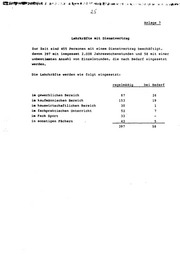 Anlage 7 Lehrkräfte mit Dienstvertrag Zur Zeit sind 455 Personen mit einem Dienstvertrag beschäftigt, davon 397 mit insgesamt 2.008 Jahreswochenstunden und 58 mit einer unbestLBmten Anzahl von Einzelstunden, die nach Bedarf eingesetzt werden. Die Lehrkräfte werden wie folgt eingesetzt: regelmäßig bei Bedarf im gewerblichen Bereich 87 26 im kaufmännischen Bereich 153 19 i• hauswirtschaftliehen Bereich 30 1 im fachpraktischen Unterricht 52 7 im Fach Sport 33 in sonstigen Fächern 42 5 397 58