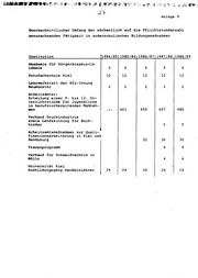 Anlage 5 Lehrer-Mehrbedarf durch veranderung der Stundentafeln für Fachklassen nachgeordneter Ausbildungsberufe Zahl der Rechnenscher Mehrbedarf Berufe r Klassen im Jahr der in den durch Verlängerung Veränderung Folgejahren der Ausbildung 1985/86 - - - - - 1986/87 1 12 2 1987/88 12 81 14 2 1988/89 50 14 I: 4 6 I' 9 I i 1989/90 17 132 I' 22 II 9 - 1990/91 22 4 1991/92 4 1992/93 11 Weil eine neue Stundentafel jeweils für das erste Ausbildungsjahr eines neugeordneten Berufs gilt, ergibt sich in den Folgejahren ein ebenso großer Mehrbedarf. Soweit eine Ausbildung verlängert würde, entsteht in den zusätz- lichen Ausbildungsjahren ein weiterer Mehrbedarf. Die rechnerisch möglichen Einsparungen durch zurückgehende Schüler- zahlen werden weitgehend durch zurückgehende Klassenfrequenzen aufgewogen.