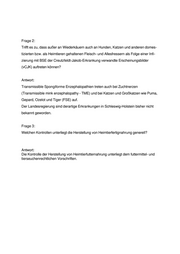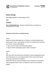 SCHLESWIG-HOLSTEINISCHER LANDTAG Drucksache 15/595 15. Wahlperiode 00-12-11 Kleine Anfrage des Abgeordneten Dr. Heiner Garg (F.D.P.) und Antwort der Landesregierung – Ministerin für ländliche Räume, Landesplanung, Landwirtschaft und Tourismus Sicherheit und Kontrolle von Heimtiernahrung Frage 1: Werden die einzelnen Bestandteile, die zur Produktion von Heimtierfertignahrung ein- gesetzt werden (Trocken- und Nassfutter), für Fleisch- bzw. Allesfresser wie Hunde, Kat- zen, Frettchen und Igel auf BSE getestet? • Falls ja, seit wann werden welche Bestandteile getestet? • Falls nein, hält die Landesregierung solche Tests für erforderlich? Antwort: nein. BSE-Tests werden nach Schaffung der erforderlichen Untersuchungskapazität bei allen über 30 Monate alten not- und krankgeschlachteten Rindern sowie bei allen über 30 Monate alten Schlachtrindern durchgeführt. Weitere BSE-Tests der einzelnen Bestandteile, die zur Produktion von Heimtierfertig- nahrung eingesetzt werden (Trocken- und Nassfutter) werden nicht für erforderlich gehalten.. 1