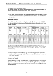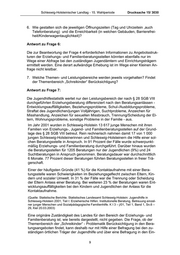 Drucksache 15/ 3030 Schleswig-Holsteinischer Landtag - 15. Wahlperiode richtungen selbst beantwortet werden. Im Übrigen wird auf den Bericht der Landesregierung über „Hilfekonzepte für El- tern im Umgang mit Schreikindern“, Drs. 15/91, verwiesen. 8. Wie ist die Inanspruchnahme der Angebote durch a) Mütter, b) Väter, c) Eltern gemeinsam sowie in Verbindung mit den Kindern und nach den verschiednen Angeboten? Antwort zu Frage 8: Mit der folgenden Tabelle können Angaben zu den Beratungen nach § 28 SGB VIII gemacht werden. Weitere Beratungsleistungen werden statistisch nicht diffe- renziert erhoben. Beratung/Therapie setzt an Geschlecht Ins- bei den jungen bei den Eltern bei den jungen Menschen b.d. Eltern Alter von…. gesamt Menschen in der und außerdem u. außerdem in der bis allein in allein in einer Familie bei in der im in der im Familie unter…… einer Gruppe den Fami- sozia- Fa- sozial u. im Jahren Gru- Eltern lie len milie en sozia- ppe Umfeld Um- len feld Umfeld allein Insgesamt 13617 1125 51 7505 82 1889 1709 359 85 552 176 84 unter 3… 949 3 - 763 7 113 19 - - 28 8 8 3-6 2205 10 1 1588 18 282 144 9 1 93 43 16 6-9 2575 48 11 1562 17 324 393 50 5 107 44 14 9 - 12 2802 84 12 1425 17 400 567 89 16 128 47 17 12 - 15 2418 173 14 1093 18 428 380 121 25 122 26 18 15 - 18 1672 342 6 737 3 244 170 73 26 55 6 10 18 - 21 592 239 4 217 2 65 28 12 8 16 1 - 21 - 24 260 130 2 87 - 24 6 4 2 3 1 1 24 - 27 144 96 1 33 - 9 2 1 2 - - - (Quelle: Statistische Berichte. Statistisches Landesamt Schleswig-Holstein: Jugendhilfe in Schleswig-Holstein 2001, Teil I: Erzieherische Hilfen. Institutionelle Beratung, Betreuung einzel- ner junger Menschen und Sozialpädagogische Familienhilfe. K I 3 – j/01, Teil 1, Band 1, S. 21, Kiel 20.03.2003) 9. Welche Altersgruppen der Kinder und welche Themenbereiche werden be- sonders stark nachgefragt? Ist der Themenbereich „Schreikinder“ in besonde- rem Maße relevant? Antwort zu Frage 9: Die nachfolgende Tabelle enthält Angaben zum Beratungsanlass, dem Themen- bereich sowie der jeweiligen Altersgruppe zur Erziehungsberatung gem. § 28 SGB VIII. Weitere Beratungsleistungen werden statistisch nicht wie gefragt diffe- renziert erhoben. 10