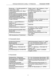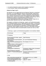 Drucksache 15/ 3030 Schleswig-Holsteinischer Landtag - 15. Wahlperiode 2. An welchen Standorten werden welche Angebote vorgehalten? 3. Wer ist jeweils Träger des Beratungsangebotes? Antwort zu Frage 2 und 3: Die Standorte und die Trägerschaft sind der folgenden Übersicht zu entnehmen. Das Kinder- und Jugendhilfegesetz regelt die Leistungsinhalte, enthält jedoch keine organisatorischen Vorgaben, in welcher Trägerschaft, Organisationsform bzw. in welcher Verknüpfung mit anderen Beratungsleistungen diese Aufgaben wahrgenommen werden. Die Zuweisung von Aufgaben der Erziehungs- und Fa- milienberatung obliegt der Organisationshoheit der Kommunen. Je nach Organisationsentscheidung des zuständigen örtlichen Trägers der Ju- gendhilfe bieten öffentliche oder freier Träger die Beratung an. Die Angaben zum Bestand an Erziehungs-, Jugend- und Familienberatungsstel- len in Schleswig-Holstein und ihre Trägerschaft sind dem letzten, im Januar 2001 im Rahmen der Jugendhilfestatistik durch das Statistische Landesamt erstellten, Verzeichnis der Einrichtungen der Jugendhilfe in Schleswig-Holstein (Stand 31.Dezember 1998, korrigierte Fassung), entnommen. Das aktuelle Verzeichnis (Stand 31.Dezember 2002) wird derzeit erstellt und steht noch nicht zur Verfü- gung. 1. Erziehungs-, Jugend- und Familienberatungsstellen in den kreisfreien Städten Einrichtungen Träger 1.1 Flensburg Beratungsstelle für Kinder, Jugend- Stadt Flensburg liche und Eltern Beratungszentrum des Kirchenkrei- Ev.-Luth. Kirchenkreis Flensburg ses Flensburg PRO Familia Sexualpädagogisches Pro Familia LV S.-H. e.V. Team Wagemut Anlauf u. Beratungsstelle “ f. sexuell miß. Kinder u.Jugendl. PRO Familia Beratungsstelle “ Flensburg Pädagogische Frühförderung Kindergarten Adelby GmbH, Sonderpäd. Einrichtungen / DPWV Beratungsstelle für Integration “ Jugend- u. Familienberatungsstelle Deutscher Kinderschutzbund e.V. OV Flensburg 1.2 Kiel PRO Familia Beratungsstelle Kiel Pro Familia LV S.-H. e.V. / DPWV Erziehungsberatungsstelle Nord Stadt Kiel Autonomes Mädchenhaus Anlauf- Lotta e.V. / DPWV u. Beratungsstelle 2