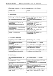 Drucksache 15/ 3030 Schleswig-Holsteinischer Landtag - 15. Wahlperiode Lebensberatung Lütjenburg Plön / DW Beratungsstelle in Erzieh.- und Diakonisches Werk des Kirchenkreises Lebensfragen Preetz Plön / DW 2.7 Rendsburg-Eckernförde Erziehungs- und Lebensberatungs- Ev.-Luth. Kirchenkreis Rendsburg / DW stelle Altenholz Sozial- und Dienstleistungszentrum Ev.-Luth. Kirchengemeinde Bordesholm / Bordesholm DW Erziehungs- und Lebensberatungs- Ev.-Luth. Kirchenkreis Rendsburg / DW stelle Eckernförde KITZ Eckernförde, Eckernförde KITZ Eckernförde, Claudia u. Bernt Carl GbR / W Sozial- und Dienstleistungszentrum DRK KV Rendsburg-Eckernförde / DRK Eckernförde Sozial- und Dienstleistungszentrum Ev.-Luth. Kirchengemeinde Kosel / DW Fleckeby Diakoniestation Hademarschen, Ev.-Luth. Kirchengemeinde / DW Hanerau-Hademarschen Erziehungs- und Lebensberatungs- Ev.-Luth. Kirchenkreis Rendsburg- stelle Hohenwestedt Eckernförde / DW Sozial- und Dienstleistungszentrum Verin f. Sozialarbeit u. Bürgerengage- Molfsee ment / SJP Erziehungs- und Lebensberatungs- Ev.-Luth. Kirchenkreis Rendsburg- stelle Nortorf Eckernförde / DW Luna - Beratungsstelle gegen sexu- PÄDAL - Päd. Alternative Rendsburg elle Gewalt Rendsburg e.V. / DPWV pädal/Pro Familia - Beratungsstelle PÄDAL - Päd. Alternative Rendsburg Rendsburg e.V. / DPWV Förder- u. Therapiezentrum Rends- Förder- und Therapiezentrum e.V. / burg DPWV Beratungsstelle sexueller Ev.-Luth. Kirchenkreis Rendsburg- Missbrauch Rendsburg Eckernförde / DW Schwangerschaftskonfliktberatung Ev.-Luth. Kirchenkreis Rendsburg- Rendsburg Eckernförde / DW Erziehungs- und Lebensberatungs- Ev.-Luth. Kirchenkreis Rendsburg- stelle Rendsburg Eckernförde / DW Streetworkprojekt Rendsburg Gemeinde Büdelsdorf 2.8 Schleswig-Flensburg Erziehungsberatungsstelle Ev.-Luth. Kirchenkreis Schleswig – Norderstapel Kirchenkreisamt / DW Beratungsstelle Norderstapel Ev.-Luth. Kirchenkreis Schleswig – Kirchenkreisamt / DW 6
