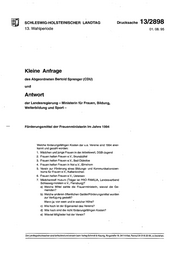 SCHLESWIG-HOLSTEINISCHER LANDTAG Drucksache 13/2898 13. Wahlperiode 01.08.95 Kleine Anfrage des Abgeordneten Bertold Sprenger (CDU) und Antwort der Landesregierung - Ministerin für Frauen, Bildung, Weiterbildung und Sport- Förderungsmittel der Frauenministerin im Jahre 1994 Welche förderungsfähigen Kosten der u.a. Vereine sind 1994 aner- kannt und gezahl worden: 1. Mädchen und junge Frauen in der Arbeitswelt, DGB-Jugend 2. Frauen helfen Frauen e. V., Brunsbüttel 3. Frauen helfen Frauen e.V., Bad Oldesloe 4. Frauen helfen Frauen in Not e.V., Elmshom 5. Verein zur Förderung eines Bildungs- und Kommunikationszen- trums für Frauen e.V., Kaltenkirchen 6. Frauen helfen Frauen e.V., Uetersen 7. Mädchentreff Husum (Träger ist PRO FAMILIA, Landesverband Schleswig-Holstein e.V., Flensburg)? a) Welche Mittel zahlte die Frauenministerin, wieviel die Ge- meinden? b). Welche anderen öffentlichen Geider/Förderungsmittel wurden zur Vertügung gestellt? Wenn ja: von wem und in welcher Höhe? c) Wie hoch ist der Eigenanteil des Vereins? d) Wie hoch sind die nicht förderungsfähigen Kosten? e) Wieviel Mitglieder hat der Verein? Die Landtagsdrucksachen sind fortlaufend und einzeln beim Ver1ag Schmid1 & Klaunig, Ringstraße 19, 24114 Kiel, Fernruf 04 31/6 20 95, zu beziehen.