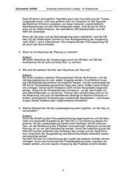 Drucksache 19/2008 Schleswig-Holsteinischer Landtag - 19. Wahlperiode Stadt Elmshorn durchgeführt. Nachdem auch nach Durchführung der Trassie- rungsstudie immer noch eine größere Zahl von Varianten für den Spurplan des Bahnhofs Elmshorn existieren und diese Varianten unterschiedliche Wechselwirkungen mit dem Bahnhofsprojekt haben, wird derzeit ein Work- shop mit der Stadt Elmshorn, den betroffenen DB-Gesellschaften und der NAH.SH vorbereitet. Wenn der Spurplan und die Bahnsteigkonfiguration feststehen, wird die DB Netz AG die notwendigen Schritte für eine Auftragserteilung der Vorplanung nach HOAI 1 und 2 unternehmen. Den entsprechenden Planungsauftrag hat sie durch den Bund erhalten. 3. Wann ist mit Abschluss der Planung zu rechnen? Antwort: Mit einem Abschluss der Vorplanungen durch die DB Netz und DB Sta- tion&Service AG ist nicht vor Ende 2021 zu rechnen. 4. Wie sind die weiteren Schritte nach Abschluss der Planung? Antwort: Bei einem positiven weiteren Planungsverlauf könnte die Entwurfs- und Ge- nehmigungsplanung ein Jahr später vorgelegt werden. Anschließend muss das Planfeststellungsverfahren durchgeführt werden. Derzeit veranschlagt die DB AG für Planfeststellungsverfahren etwa zwei Jahre. Sollten keine Einsprü- che vorliegen, könnte somit frühestens 2025 mit den Bauarbeiten begonnen werden. Aufgrund der Komplexität des Vorhabens – es gilt, das Projekt mit dem Bahnhofsprojekt zu verzahnen, Themen des Lärmschutzes sind von ho- her Bedeutung und auch die betrieblichen Belange im Bahnhof Elmshorn er- fordern umfangreiche Vorbereitungen anstehender Bauarbeiten – sind Anpas- sungen dieses Zeitplans aber möglicherweise erforderlich. 5. Welche Maßnahmen hat die Landesregierung wann ergriffen, um den Bau vo- ranzutreiben? Antwort: Durch die Schaffung des Planungsbeschleunigungsprogramms und die finan- zielle und personelle Ausstattung der NAH.SH zur Durchführung dieses Pro- gramms, hat die Landesregierung bereits einen wichtigen Schritt unternom- men, um die Realisierung des Projektes voranzubringen. Hierdurch konnte die Planung um ca. ein Jahr beschleunigt werden. Durch die Federführung bei der NAH.SH konnten außerdem die Interessen des Landes und der Stadt Elms- horn hinsichtlich der Neugestaltung des Bahnhohsumfelds wesentlich besser berücksichtigt werden. Die NAH.SH wird mit Unterstützung des Landes die weiteren Schritte intensiv verfolgen. Durch eine kontinuierliche Projektbegleitung sollen Leerläufe ver- mieden werden und eine rasche Umsetzung des Projektes erreicht werden. 2