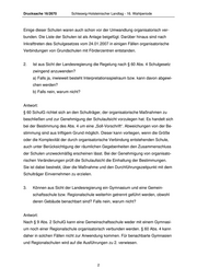 Drucksache 16/2670 Schleswig-Holsteinischer Landtag - 16. Wahlperiode Einige dieser Schulen waren auch schon vor der Umwandlung organisatorisch ver- bunden. Die Liste der Schulen ist als Anlage beigefügt. Darüber hinaus sind nach Inkrafttreten des Schulgesetzes vom 24.01.2007 in einigen Fällen organisatorische Verbindungen von Grundschulen mit Förderzentren entstanden. 2. Ist aus Sicht der Landesregierung die Regelung nach § 60 Abs. 4 Schulgesetz zwingend anzuwenden? a) Falls ja, inwieweit besteht Interpretationsspielraum bzw. kann davon abgewi- chen werden? b) Falls nein, warum nicht? Antwort: § 60 SchulG richtet sich an den Schulträger, der organisatorische Maßnahmen zu beschließen und zur Genehmigung der Schulaufsicht vorzulegen hat. Es handelt sich bei der Bestimmung des Abs. 4 um eine „Soll-Vorschrift“. Abweichungen von der Be- stimmung sind aus triftigem Grund möglich. Dieser kann vorliegen, wenn die Größe oder die Komplexität der durch organisatorische Verbindung entstehenden Schule, auch unter Berücksichtigung der räumlichen Gegebenheiten den Zusammenschluss der Schulen unzweckmäßig erscheinen lässt. Bei der Genehmigung von organisato- rischen Veränderungen prüft die Schulaufsicht die Einhaltung der Bestimmungen. Sie ist dabei bestrebt, über die Maßnahme und den Durchführungszeitpunkt mit dem Schulträger Einvernehmen zu erzielen. 3. Können aus Sicht der Landesregierung ein Gymnasium und eine Gemein- schaftsschule bzw. Regionalschule weiterhin getrennt geführt werden, obwohl deren Gebäude benachbart sind? Falls nein, warum nicht? Antwort: Nach § 9 Abs. 2 SchulG kann eine Gemeinschaftsschule weder mit einem Gymnasi- um noch einer Regionalschule organisatorisch verbunden werden. § 60 Abs. 4 kann daher in solchen Fällen nicht zur Anwendung kommen. Für benachbarte Gymnasien und Regionalschulen wird auf die Ausführungen zu 2. verwiesen. 2