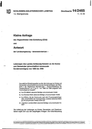 I SCHLESWIG-HOLSTEINISCHER LANDTAG Drucksache 14/2465 14. Wahlperiode 11. 10.99 Kleine Anfrage des AbgeOrdneten Uwe Eichelberg (CDU) und Antwort der Landesregierung -Innenministerium - Leistungen des Landes Schleswig-Holstein an die Kreise und Gemeinden (einschließlich kommunale Sondervermögen) von 1988 bis 1999 Aus welchen Einnahmequellen wurden die Leistungen an Kreise und Gemeinden (einschließlich kommunale Sondervermögen) der Über- sicht 7 der Allgemeinen Bemerkungen - Zusammenstellung der Hauptfunktionen von 0 bis 9- von 1988 bis 1999 aufgeteilt nach Haushaltsjahren bezahlt? a) Aus EU-Mitteln (absolute Beträge und prozentualer Anteil) b) Aus Bundesmitteln (albsolute Beträge und prozentu;ller Anteil) c) Aus Mitteln, die den Kommunen nach dem Finanzausgleichsge- setz, einschließlich der VorwegabzOge, zustehen (absolute Beträ- ge und prozentualer Anteil) sowie aus d) originären Landesmitteln (absolute Beträge und prozentualer An- teil)? Die Aufteilung der Leistungen an Kreise, Gemeinden und Zweckver- bände ergibt sich aus den beigefügten Anlagen. Die AufschlüsseJung Die Landtagsdrucksachen sindfortlaufend und einzeln beim Vertag Schmidt & Klaunig, Ringstraße 19,24114 Kiel, Tel. (043_1) 66064-0, Fax {0_431) 660 64#24,zu beziehen. ---- _- ____ - _-_- _--- ---------- --··-·- ---:·-·-~-----~" ,... :::-~----~=:..·_:"~':·---:·::.::::::'""'"" ····;\· ' . - .