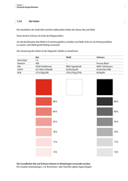 Kapitel 1 Corporate Design Elements 1.2.0 Die Farben Die Hausfarben der Stadt Köln sind die traditionellen Farben der Hanse: Rot und Weiß. Hinzu kommt Schwarz als Farbe des Wappenadlers. Um die Kombination Rot-Weiß im Erscheinungsbild zu erhalten und Weiß nicht nur als Hintergrundfarbe zu nutzen, wird Weiß gezielt flächig verwendet. Die Umsetzung der Farben ist der folgenden Tabelle zu entnehmen: HKS K/N/E Pantone RAL CMYK RGB Rot 13 485 3020 Verkehrsrot 0c/100m/100y/0k 237r/28g/36b Weiß – – 9003 Signalweiß 0c/0m/0y/0k 255r/255g/255b Schwarz – Process Black 9005 Tiefschwarz 0c/0m/0y/100k 0r/0g/0b 80 % 80 % 60 % 60 % 45 % 45 % 30 % 30 % 15 % 15 % 10 % 10 % Die Grundfarben Rot und Schwarz können in Abstufungen verwendet werden. Für einzelne Anwendungen, z. B. Broschüren- oder Flyertitel, gelten eigene Regeln.