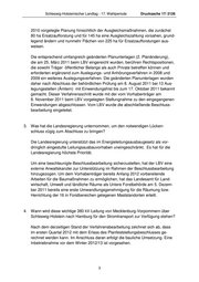 Schleswig-Holsteinischer Landtag - 17. Wahlperiode Drucksache 17/ 2126 2010 vorgelegte Planung hinsichtlich der Ausgleichsmaßnahmen, die zunächst 80 ha Ersatzaufforstung und für 145 ha eine Ausgleichszahlung vorsahen, grund- legend ändern und nunmehr Flächen von 225 ha für Ersatzaufforstungen aus- weisen. Die entsprechend umfangreich geänderten Planunterlagen (2. Planänderung), die am 25. März 2011 beim LBV eingereicht wurden, berühren Rechtspositionen, die sowohl Träger öffentlicher Belange als auch Private betreffen können und erforderten ergänzend zum Auslegungs- und Anhörungsverfahren in 2008 und 2009 ein weiteres Auslegungsverfahren. Die geänderten Planunterlagen wurden daher nach Abschluss der behördlichen Prüfung am 8. August 2011 bei 13 Aus- legungsstellen (Ämtern) mit Einwendungsfrist bis zum 17. Oktober 2011 bekannt gemacht. Dieser Verfahrensschritt wurde mit der vom Vorhabenträger am 8. November 2011 beim LBV vorgelegten Stellungnahme zu den eingegangenen Einwendungen abgeschlossen. Vom LBV wurde die abschließende Beschluss- bearbeitung eingeleitet. 3. Was hat die Landesregierung unternommen, um den notwendigen Lücken- schluss zügig zum Abschluss zu bringen? Die Landesregierung unterstützt das im Energieleitungsausbaugesetz als vor- dringlich eingestufte Leitungsausbauvorhaben uneingeschränkt. Es hat für die Landesregierung höchste Priorität. Um eine beschleunigte Beschlussbearbeitung sicherzustellen, hat der LBV eine externe Anwaltskanzlei zur Unterstützung im Rahmen der Beschlussbearbeitung hinzugezogen. Um dem Vorhabenträger bereits Anfang 2012 vorbereitende Arbeiten für die Baumaßnahmen zu ermöglichen, hat das Landesamt für Land- wirtschaft, Umwelt und ländliche Räume als Untere Forstbehörde am 5. Dezem- ber 2011 bereits eine erste Umwandlungsgenehmigung für die Räumung bzw. Herrichtung der 16 in Forstbereichen gelegenen Maststandorten erteilt. 4. Wann wird diese wichtige 380 kV-Leitung von Mecklenburg-Vorpommern über Schleswig-Holstein nach Hamburg für den Stromtransport zur Verfügung stehen? Nach dem derzeitigen Stand der Verfahrensbearbeitung zeichnet sich ab, dass im ersten Quartal 2012 mit dem Erlass des Planfeststellungsbeschlusses ge- rechnet werden kann. Im Anschluss daran erfolgt die bauliche Umsetzung. Eine Inbetriebnahme vor dem Winter 2012/13 ist vorgesehen. 3