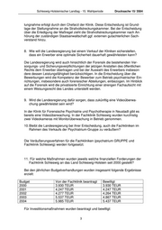 Schleswig-Holsteinischer Landtag - 15. Wahlperiode Drucksache 15/ 3584 lungnahme erfolgt durch den Chefarzt der Klinik. Diese Entscheidung ist Grund- lage der Stellungnahme an die Strafvollstreckungskammer. Bei der Entscheidung über die Erledigung der Maßregel zieht die Strafvollstreckungskammer nach An- hörung der zuständigen Staatsanwaltschaft ggf. externen gutachterlichen Sach- verstand hinzu. 8. Wie will die Landesregierung bei einem Verkauf der Kliniken sicherstellen, dass ein Erwerber eine optimale Sicherheit dauerhaft gewährleisten kann? Die Landesregierung wird auch hinsichtlich der Forensik die bestehenden Ver- sorgungs- und Sicherungsverpflichtungen der jetzigen Anstalten des öffentlichen Rechts dem Erwerber übertragen und bei der Auswahl des Erwerbers insbeson- dere dessen Leistungsfähigkeit berücksichtigen. In die Entscheidung über die Bewerbungen wird die Kompetenz der Bewerber zum Betrieb psychiatrischer Ein- richtungen, insbesondere auch forensischer Abteilungen, einbezogen. Im Hinblick auf die Forensik wird die privatisierte Einrichtung einer strengen Fachaufsicht mit einem Weisungsrecht des Landes unterstellt werden. 9. Wird die Landesregierung dafür sorgen, dass zukünftig eine Videoüberwa- chung gewährleistet sein wird? In der Klinik für Forensische Psychiatrie und Psychotherapie in Neustadt gibt es bereits eine Videoüberwachung. In der Fachklinik Schleswig wurden kurzfristig zwei Videokameras mit Monitorüberwachung in Betrieb genommen. 10. Bleibt die Landesregierung bei ihrer Entscheidung, auch die Fachkliniken im Rahmen des Verkaufs der Psychiatrium-Gruppe zu veräußern? Die Veräußerungsverfahren für die Fachkliniken (psychatrium GRUPPE und Fachklinik Schleswig) werden fortgesetzt. 11. Für welche Maßnahmen wurden jeweils welche finanziellen Forderungen der Fachklinik Schleswig an das Land Schleswig-Holstein seit 2000 gestellt? Bei den jährlichen Budgetverhandlungen wurden insgesamt folgende Ergebnisse erzielt: Budget Von der Fachklinik beantragt Bewilligt 2000 3.930 TEUR 3.930 TEUR 2001 4.247 TEUR 4.247 TEUR 2002 4.277 TEUR 4.264 TEUR 2003 5.537 TEUR 4.867 TEUR 2004 5.985 TEUR 5.437 TEUR Für Investitionsmaßnahmen wurden beantragt und bewilligt: 3