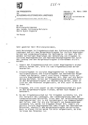 Drucksache 12/555 Schleswig-Holsteinischer Landtag- 12. Wahlperiode ~ 3. Welche Bereiche umfaßt das Aufgabengebiet des Bürgerbeauf- tragten. und auf welcher Grundlage erfolgt derzeit eine Aufga- benbegrenzung zum Petitionsausschuß? Das Aufgabengebiet ist in o. g. Organisationserlaß definiert. Die Auf- gabenabgrenzung zum Petitionsausschuß basiert auf einer zwischen dem Eingabenausschuß des Schleswig-Holsteinischen Landtages und dem Bürgerbeauftragten getroffenen Vereinbarung. Einzelheiten ergeben sich aus dem in Kopie beigefügten Schreiben der Landtags- präsidentin an den Ministerpräsidenten des Landes Schleswig-Hol- stein vom 16. März 1989. 2